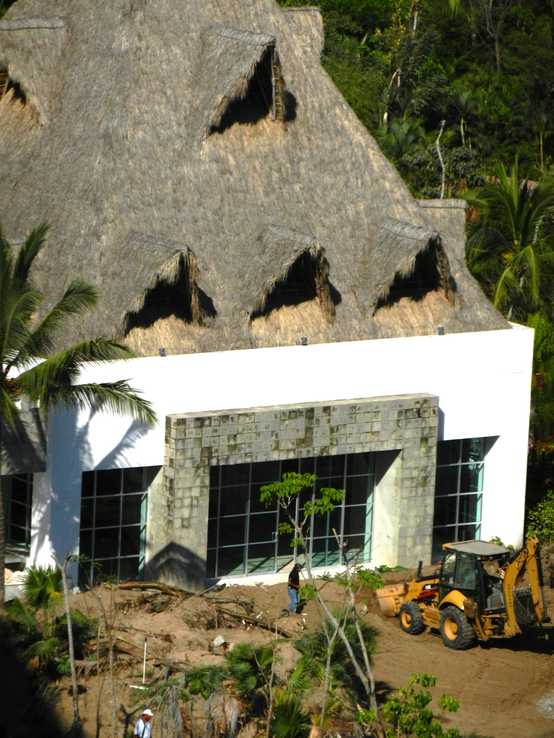 This photo shows the entry way to the Mayan Palace at Nuevo Vallarta on April 19, 2012. The thatched roof is coming down and other changes to the building are taking place. This Mayan Palace property will be used for something other than rooms, we suspect.