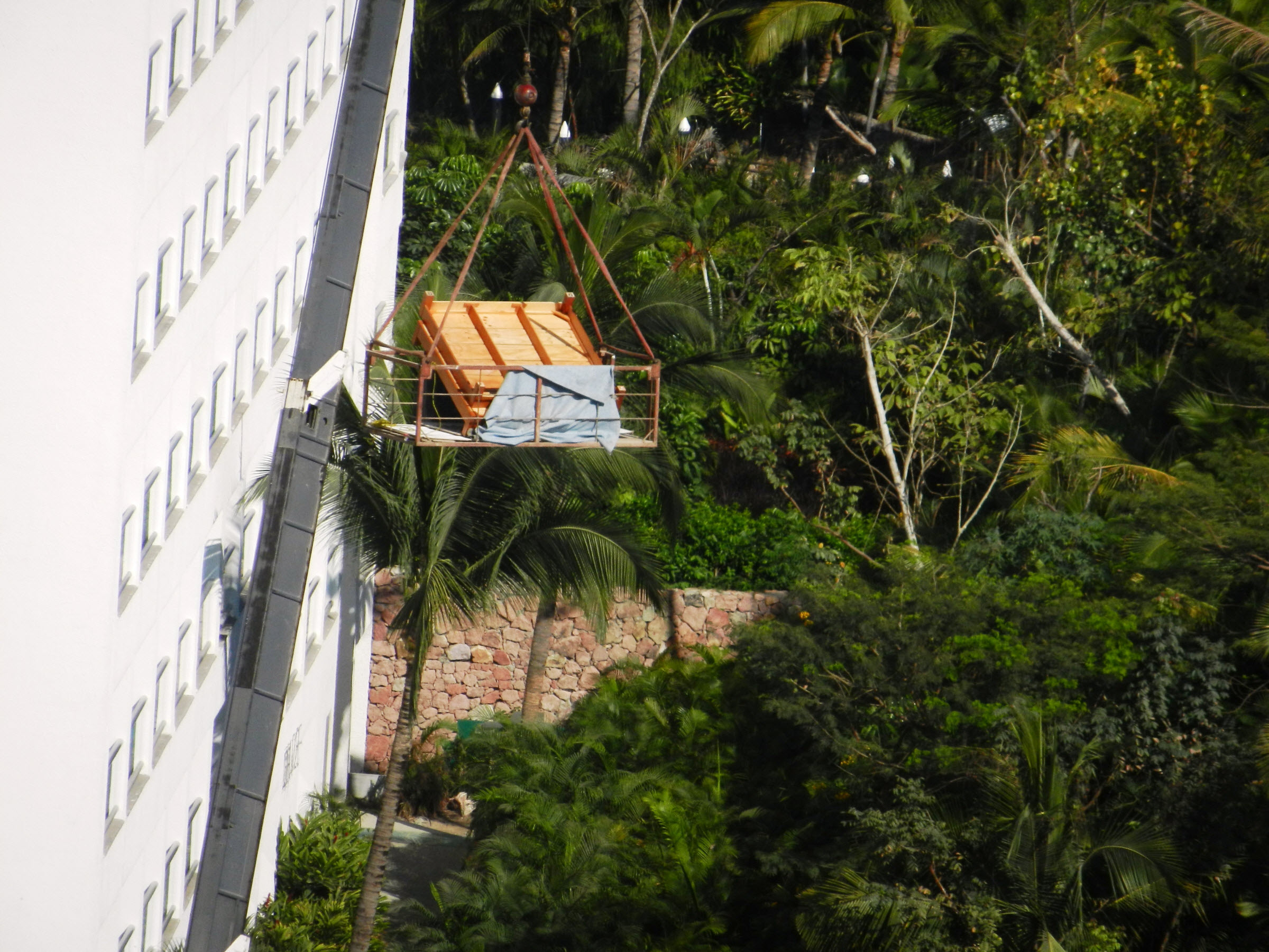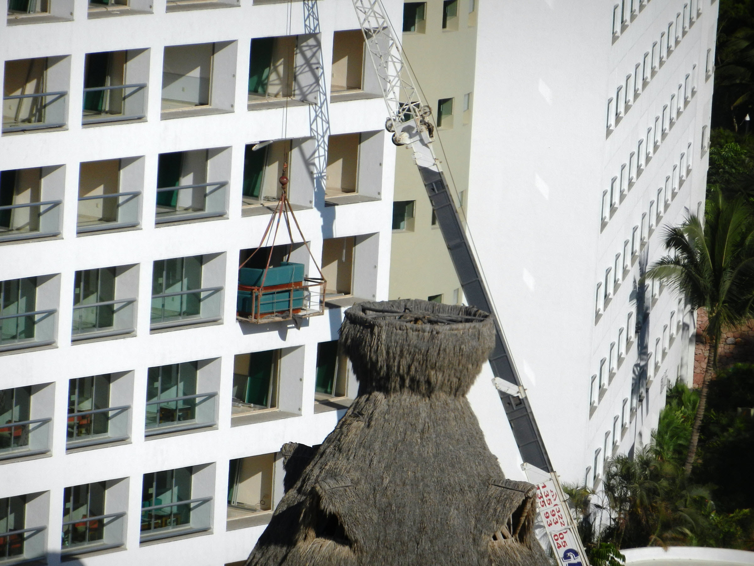 This photo is a graphic representation of the amount of work taking place on the Mayan Palace building in Nuevo Vallarta, Mexico. The entry way created by poking a large hole in the side of the building allows workers to access the ground floor of what was an operating hotel about three weeks ago, at the end of March, 2012.