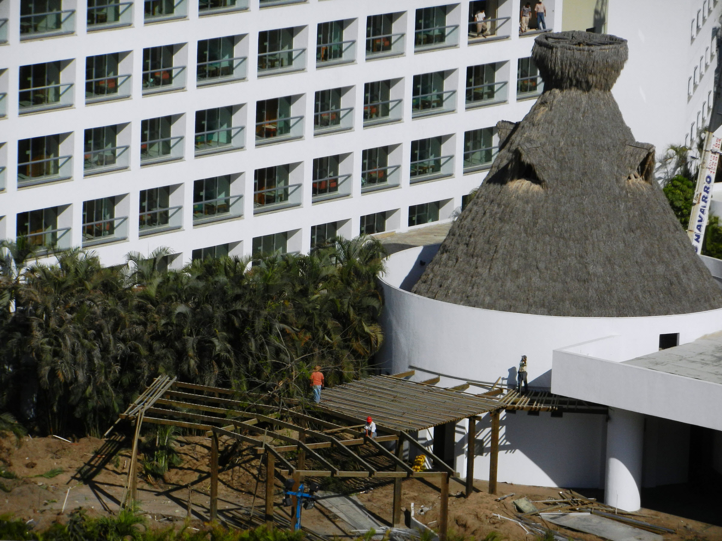 Crews were dismantling the thatched roof over the entry to the Nuevo Vallarta Mayan Palace as Adie and her family were leaving on the 21st of April. Workers were telling different stories about what would become of the Mayan Palace building. Only time will tell.