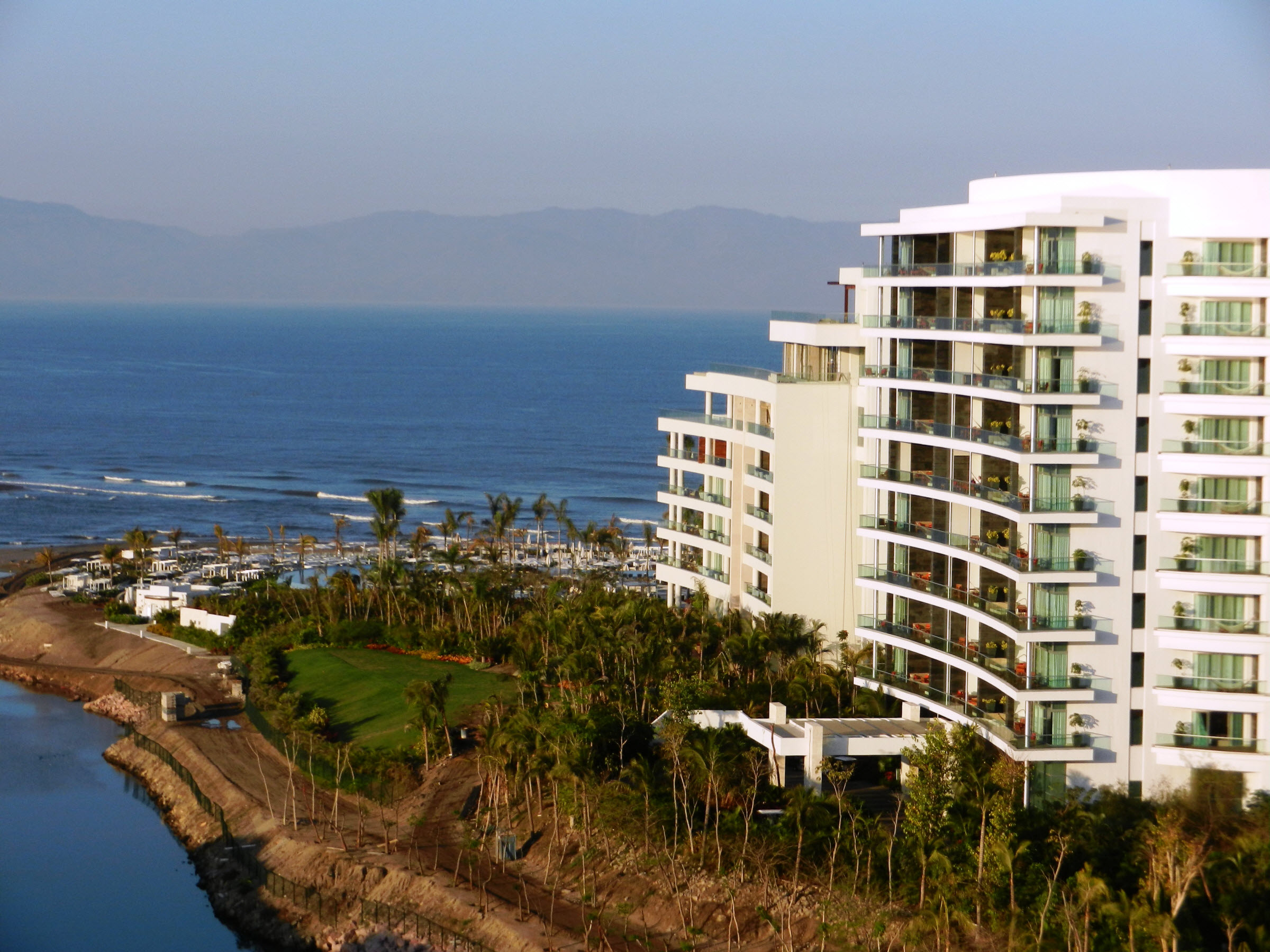 This view looking east in Nuevo Vallarta shows the Punta and Grand Luxxe Tower I buildings from the beach. Immediately in front of the Punta building are the pools and lounging areas. There are three tiers, and it seems plenty of space for all Grand Luxxe members to enjoy their vacations.
