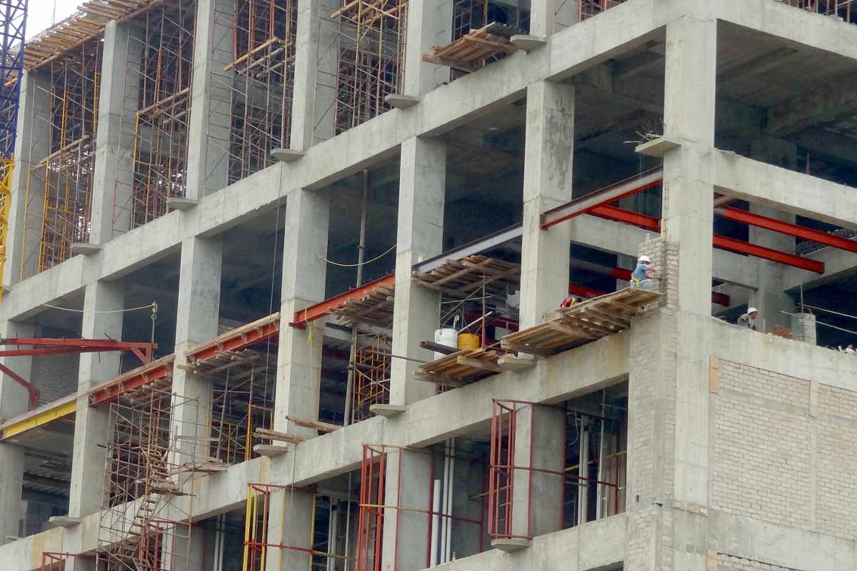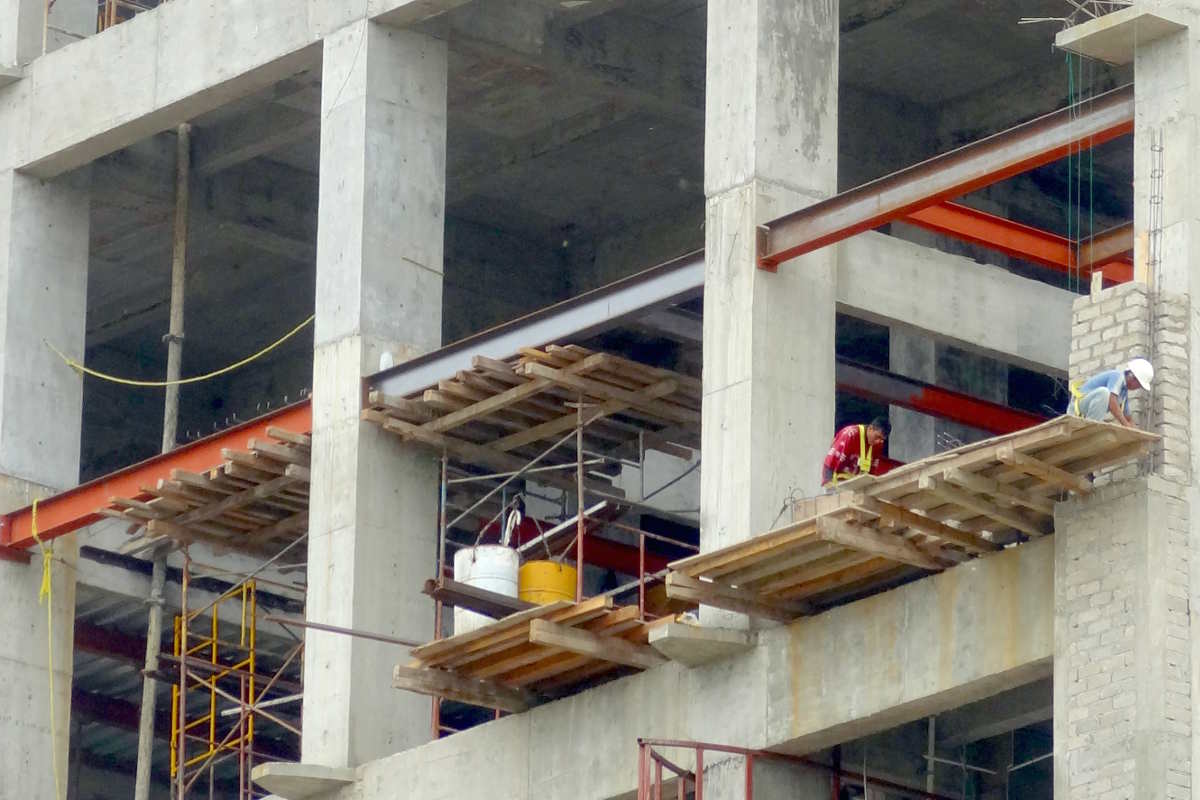 Close-up View of Residence Two Story 1 BR Loft Space Under Construction. Note the Open Space Between the Steel IBeam Above the Worker and the Concrete Interior Floor.