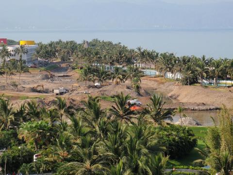 Ron took this photo of the Mayan Palace center tower, located at Nuevo Vallarta, Mexico, on May 18, 2012. It provides a distinct view through the building, down to the second floor. Renovation is significant, if not total. With the walls in the center of the building disappearing, the center tower of the Mayan Palace may not survive.GaryIII is in Nuevo Vallarta, Mexico for two weeks. This photo shows an interesting structure we are sure gljod (an Aimfair username) will be amazed at. During a recent visit, gjjod recorded earth movers taking out a new road and replacing it earth. GaryIII shows in his photo the mound has changed and is replaced by a stage of some sort.This is another photo of the stage-like mound of earth that has closed the road that allowed traffic to pass between the Grand Luxxe Tower II and the pool area in front of Grand Luxxe Tower I. This area is not open to traffic now.