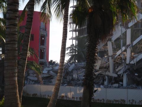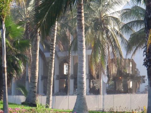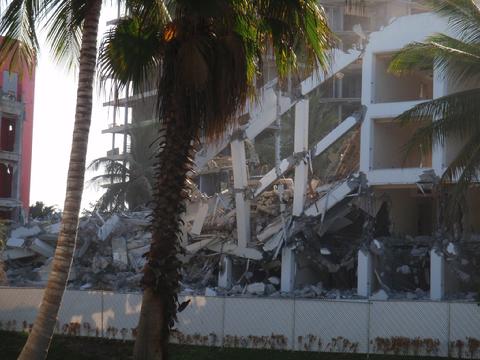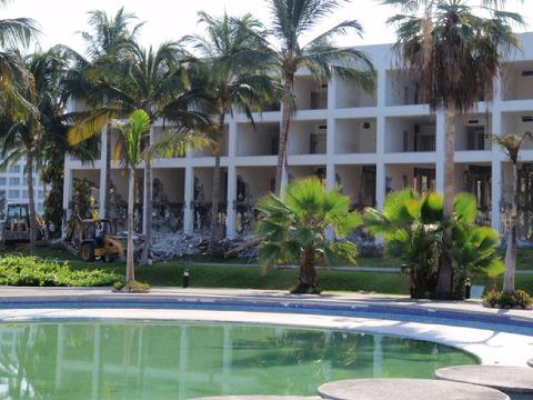 Barbara was one of the first to show changes taking place on the Mayan Palace at Nuevo Vallarta, Mexico. This photo shows tractors on the roof on June 10, 2011. Not long after, the tower was demolished.Wendy was in Nuevo Vallarta during hurricane Jova, which stopped construction and completion of Grand Luxxe Tower III A in October, 2011. Here, she shows the Mayan Palace demolition continuing to the foundation. She speculated management would rebuild, but now we know the space will remain vacant.