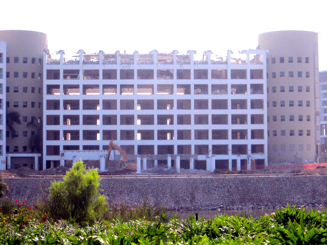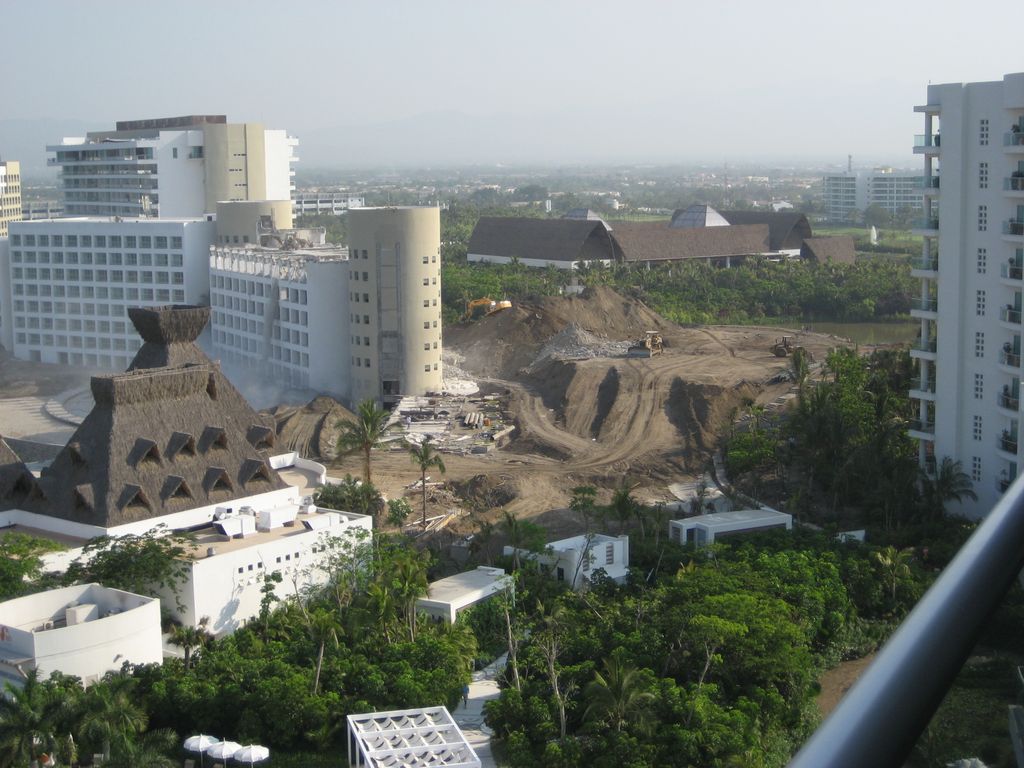 Properly placed explosives allow crews to reduce a three story Mayan Palace Tower at Nuevo Vallarta to a pile of concrete and steel. In 2007, Grupo Vidanta laid plans to build new buildings and introduce new brands of resorts called the Grand Luxxe Residence Club. Two years later, the Popular but outdated Mayan Palace Red and Yellow towers were demolished in make way for a complete renovation of the Grupo Vidanta Neuvo Vallarta Mayan property.This photo shows the remains of the Mayan Palace Red tower. The living units are now rubble. Trucks and bulldozers have created roads where water once was. These roads will allow trucks to haul away the rubble, which is all that remained after the Mayan Palace Red and Yellow towers were demolished.In the haze behind the remains of the Mayan Palace towers at the Grupo Vidanta property at Neuvo Vallarta, Mexico, one can barely make out the outline of the new Grand Luxxe Tower I that was under construction when the Mayan Palace towers were demolished. The Mayan Palace towers will be replaced by endless gardens and pathways for guests in the upper-end Luxxe Timeshare units.
