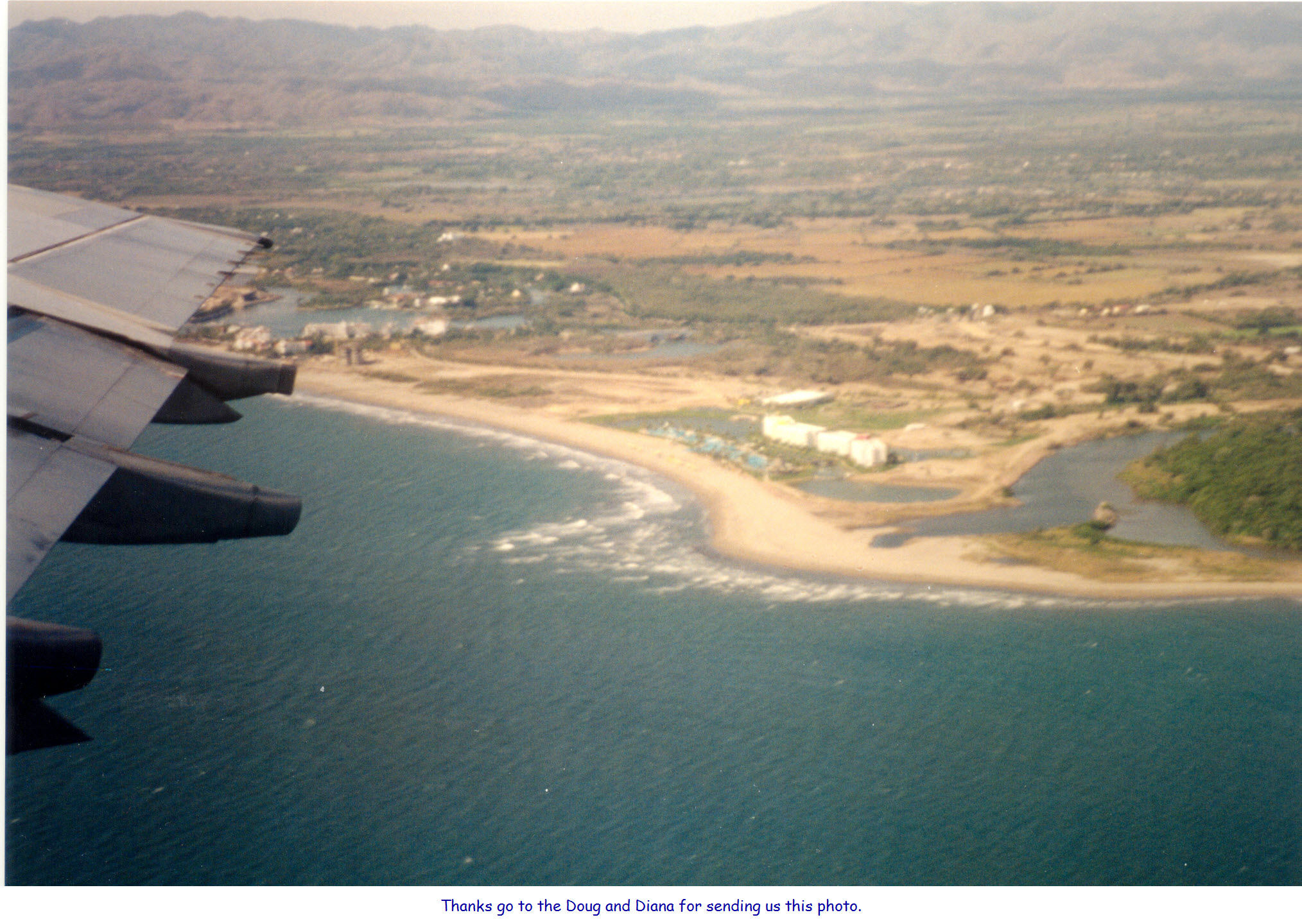 Diana and Doug were flying home when they took this photo of the Mayan Palace at Nuevo Vallarta, Mexico in 1998. The Mayan Palace was built in 1997, and in 1998, there was not much on the property yet.This photo barely shows the pristine Mayan Palace Red and Yellow Towers at the Grupo Mayan property at Nuevo Vallarta, Mexico. Nothing is there but beach and undeveloped property. Not even the sales office, where the pad is located to the right of the southern most tower.