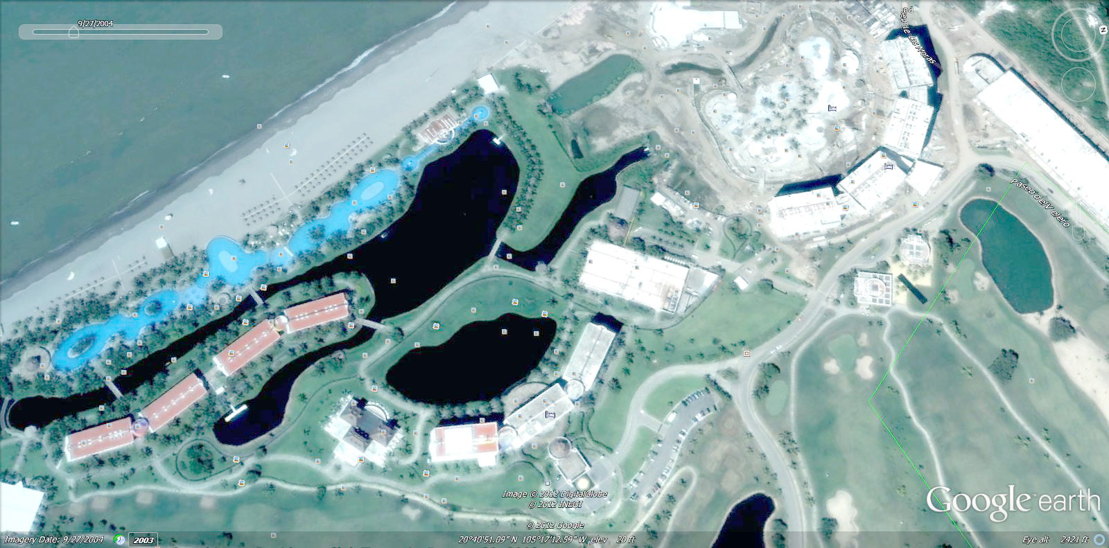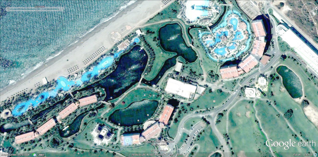 This July, 2003 Google Earth image is the earliest satellite image of the Grupo Vidanta property at Nuevo Vallarta, Mexico. The foundations for Cafe del Lago and the Grand Mayan Resorts are under construction at this time. The pools in front of the Grand Mayan was a parking lot back then. Change is the only constant at the Grupo Vidanta Nuevo Vallarta, Mexico property.Five months later, in December, 2003, two main Mayan Palace buildings and new construction at the current site of the Grand Mayan Resort at Nuevo Vallarta, Mexico appear on the property. Construction continues.Seven Mayan Palace towers are open and operating in September, 2004. Also, one or two of the Grand Mayan towers appear to be ready for occupancy. The only thing missing seems to be water in the Grand Mayan pools.