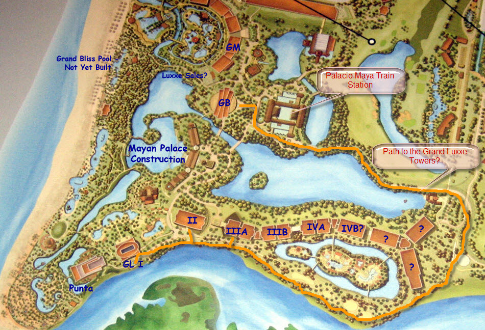 By February, 2006, the Grand Mayan pools are in and operating. The Mayan Palace was the most luxurious place on the property until the opening of the Grand Mayan. Regardless, the Mayan Palace had the best location on the property. This would remain the case for another three years, when the three story towers would be demolished.In January, 2009, the three story Mayan Palace buildings were reaching the end of their useful lives. In this Google Earth image, the property is at its best. However, to the lower right is the Grand Luxxe Tower I, which is under construction and all is about to change at the Nuevo Vallarta, Mexico property owned by Grupo Vidanta.