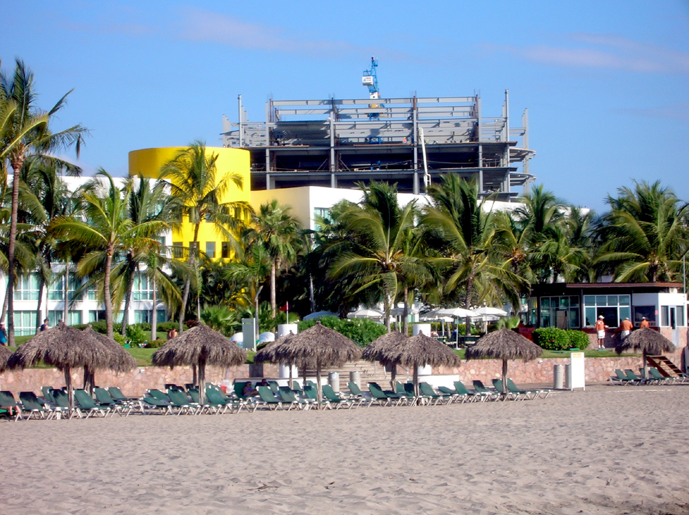 Preparing for demolishing the original Mayan Palace towers located closest to Bahia de Banderas, Mexico and pools. The Mayan Palace at Nuevo Vallarta, Mexico became a very popular vacation destination among Mexican Nationals, Canadians and Americans. Front side views = ocean and back side views = mountains. This photo shows the trucks moving tons of earth to reinvent the Grupo Vidanta Mayan property at Nuevo Vallarta, Mexico.The Mayan Palace red and yellow towers at Nuevo Vallarta were popular because guests could literally walk out their door and be on the beach or at the pool. They occupied valuable space, and in June, 2009, were demolished to make way for property upgrades. This photo shows the Red and Yellow towers before they were leveled. They were the symbols of long lasting memories of enjoyable vacations in Mexico.The Red and Yellow Mayan Palace tower units had decks that overlooked the Bahia de Banderas and the Mayan Pools. These were the most popular places to stay. In this photo, the decks are rubble and crews are preparing the level the once very popular Mayan Palace Red and Yellow towers.