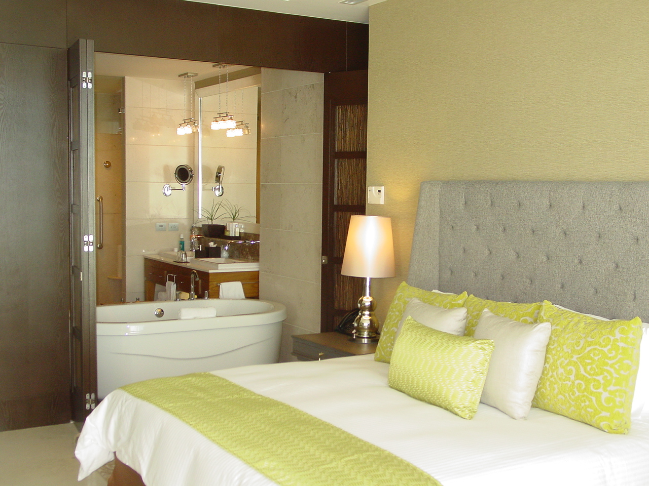 The bedrooms are about the same sizes as the bedrooms in the Grand Luxxe Villa. There is a hall way that connects the master bedroom to the living area, which provides extra privacy and is a very nice feature. The bath areas are about the same size and configurations as the Grand Luxxe Villa. There is a half bath in the Exclusive Master Villa (2 Bedroom side) and not in the Exclusive Villa.