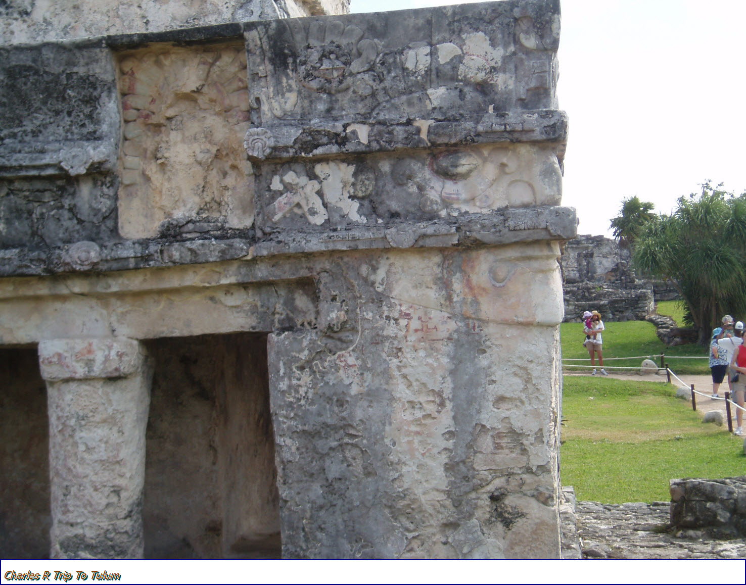 The interior of this building has original Mayan frescoes, in blue-green and outlined in black, depicting Mayan gods and religious motifs. - El Castillo - The Castle