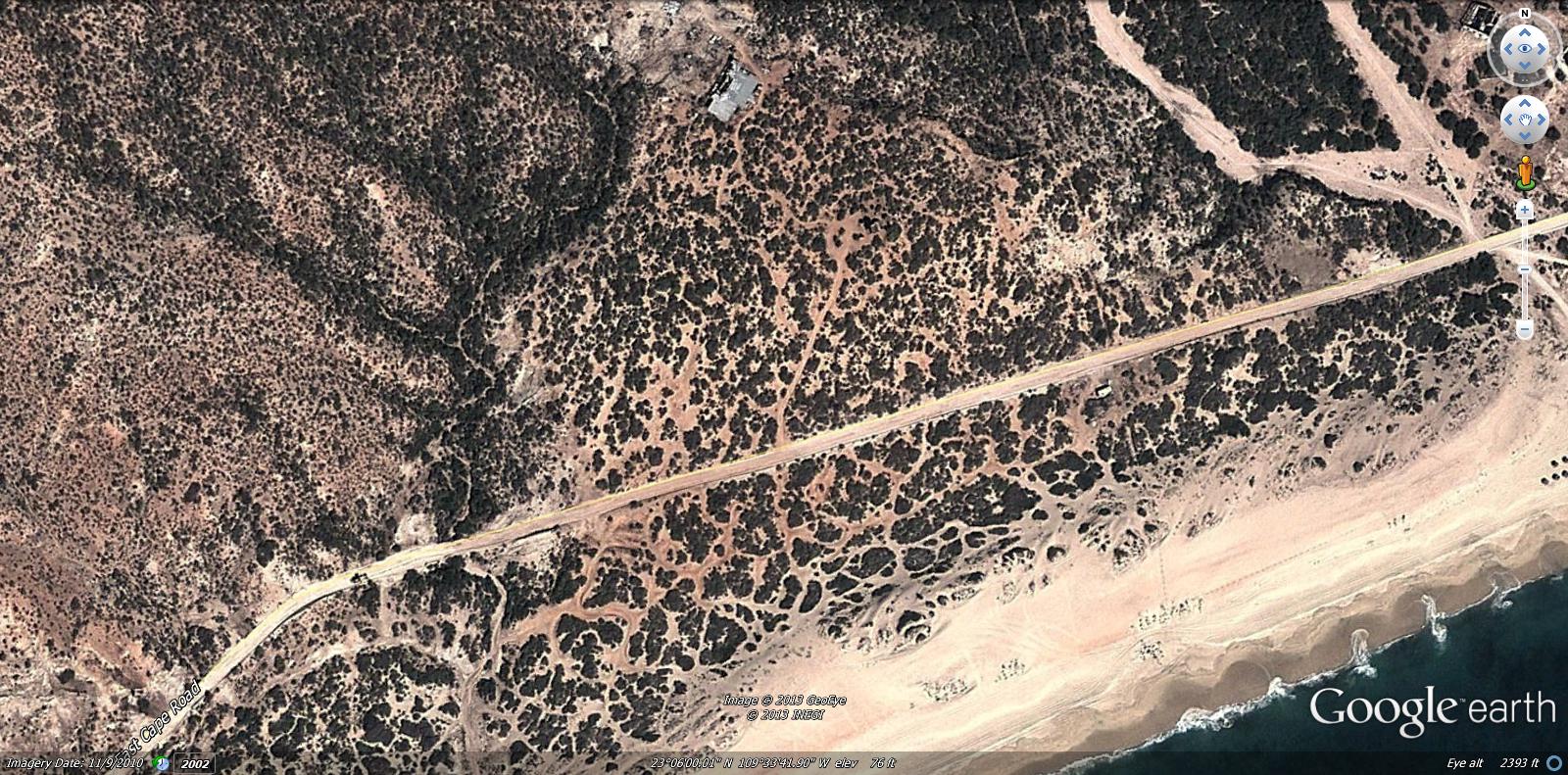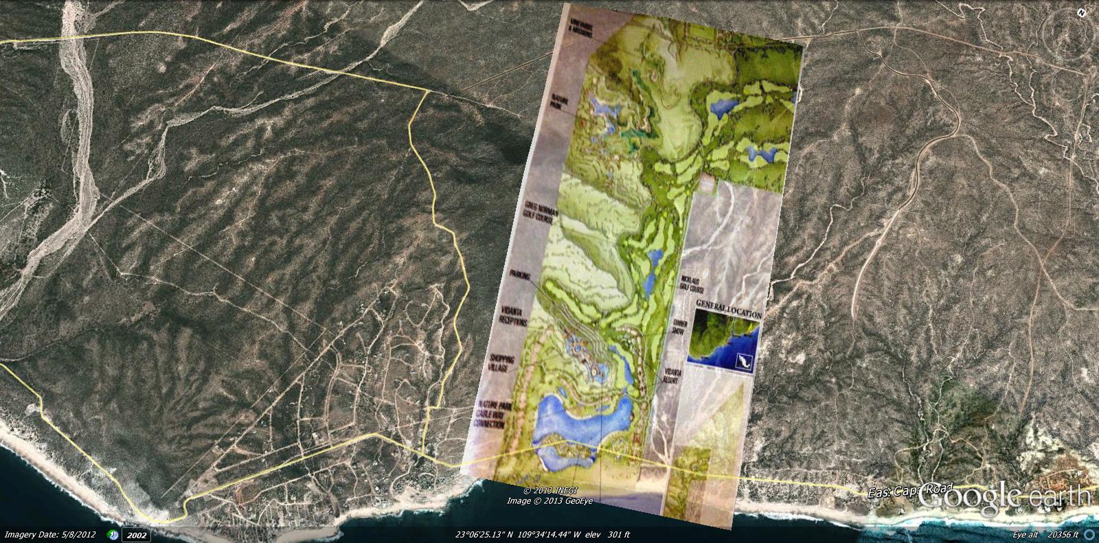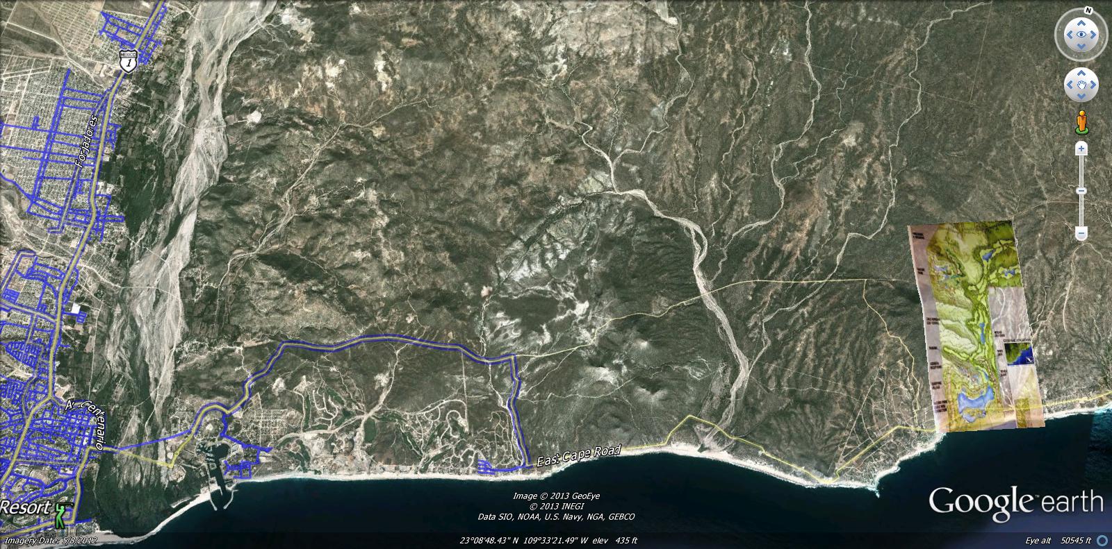 East Cape, San Jose del Cabo - follow the East Cape road east and out of San Jose del Cabo for about eight miles, look up to the left and there you will see Grupo Vidanta's East Cape property.The blue, squiggley lines you see in the above photo are land view areas in Google earth. You can actually see the terraine and surroundings and houses and cars and all that stuff. Lot's of fun!
