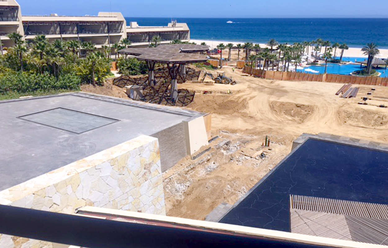 This view shows the construction from behind the fence that separates the pool area from the construction. The photos of the beach and pool were taken from the area in the distance.