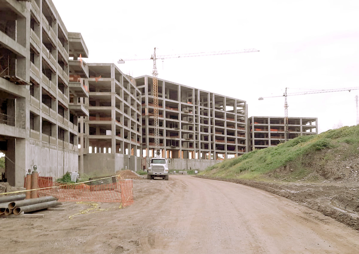 This view shows the smaller Cascades bulding next to another larger building. Names were assigned to these buildings in prior versions of the development. The larger building could be a Kingdom of the Sun family member. Note the extension of the changing topography on the right side of the photo. This photo was taken around November 16, 2020.