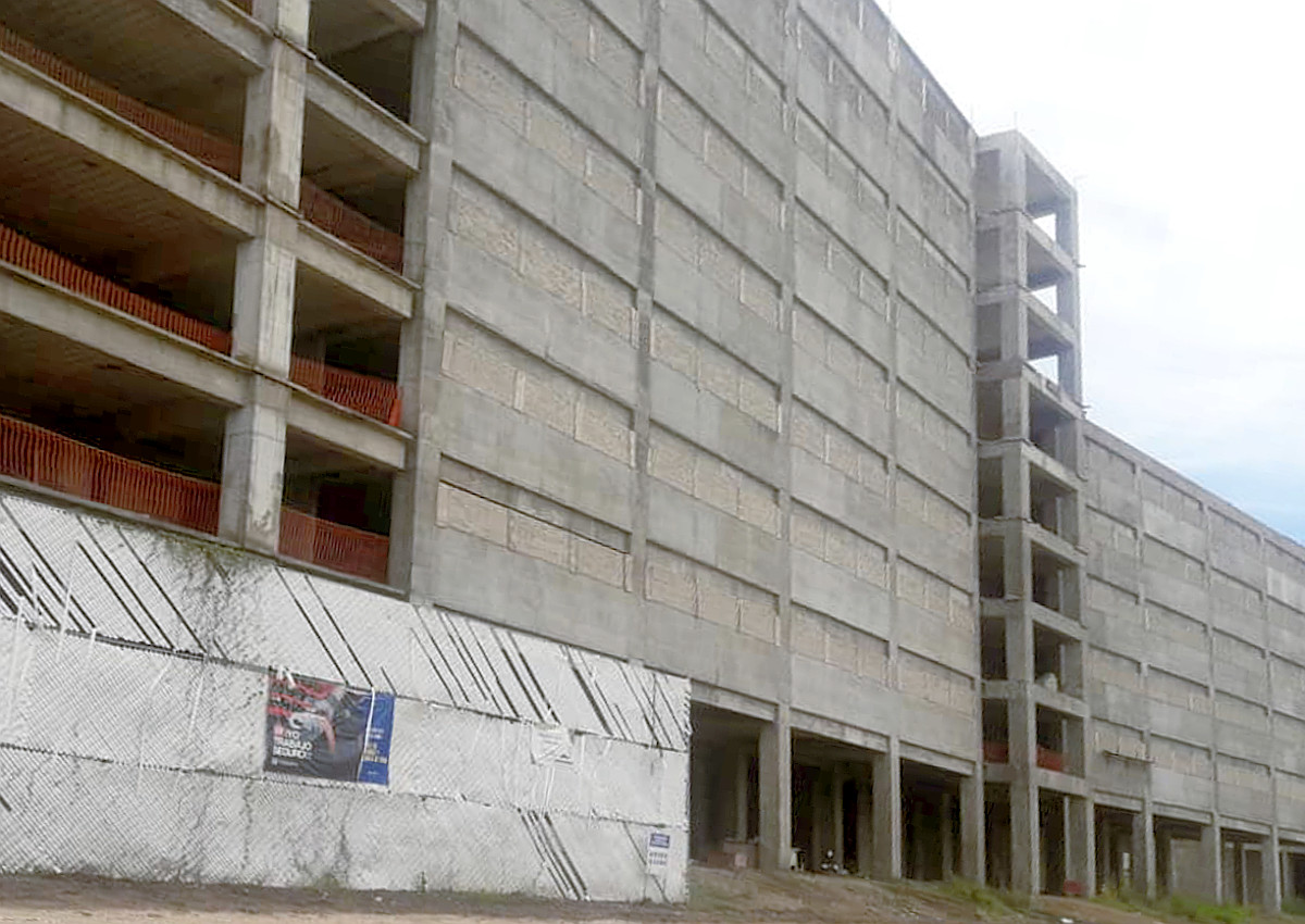 The hotels are skeletons now. The one on the left may be the Presidential Tower, and the one on the right may be one of the Kingdom of the Sun towers. Date: September 13, 2020.