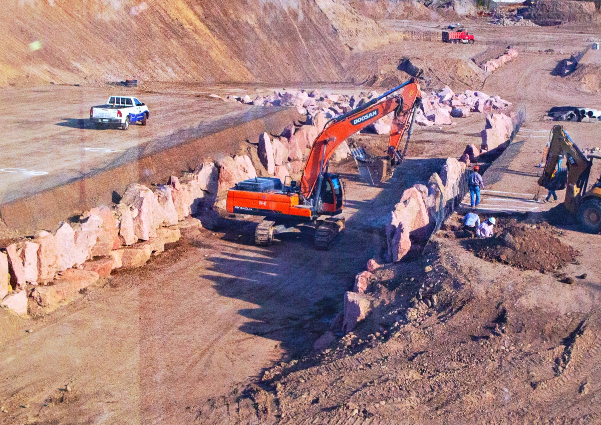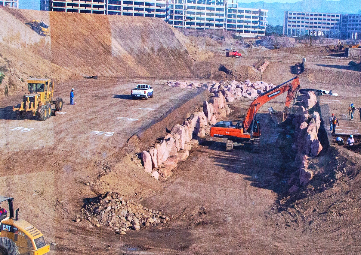An opening between two massive walls of dirt appears, and workers and equipment are at the bottom of the valley. They are installing large rocks and boulders similar to the ones installed at the Grand Bliss Lagoon, which we called Red Rock Point.