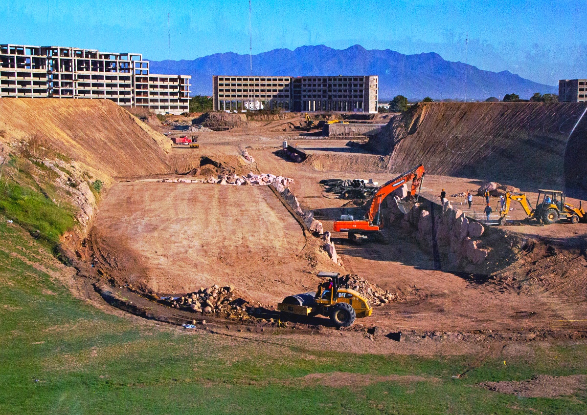The Parks I is comprised of the area west of Highway 200 to an area near Station 4. You can see in the signage a circular lagoon. This may be the circular bowl that is under construction in the following photos. It appears to be a feature that may have water spouts and a walkway around the rim. Speculation only. What do you think it will become?