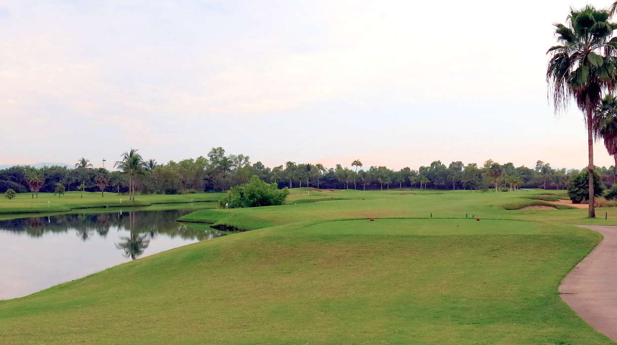 The Jack Nicklaus course first hole is near the driving range and golf academy - a long way away from Tower Five. The course proceeds along a route that parallels the river road to an area in front of Tower Five. It then moves to the area north of the taxi and valet parking area. The road at this point was used by taxis and shuttles that took guests to the outer gate to walk the Marina area. Now, foot traffic is discouraged by hotel management.