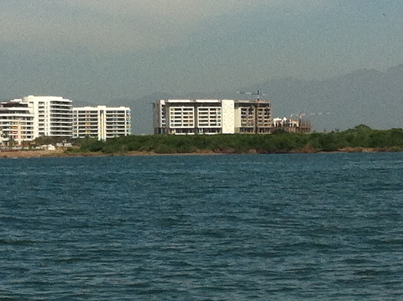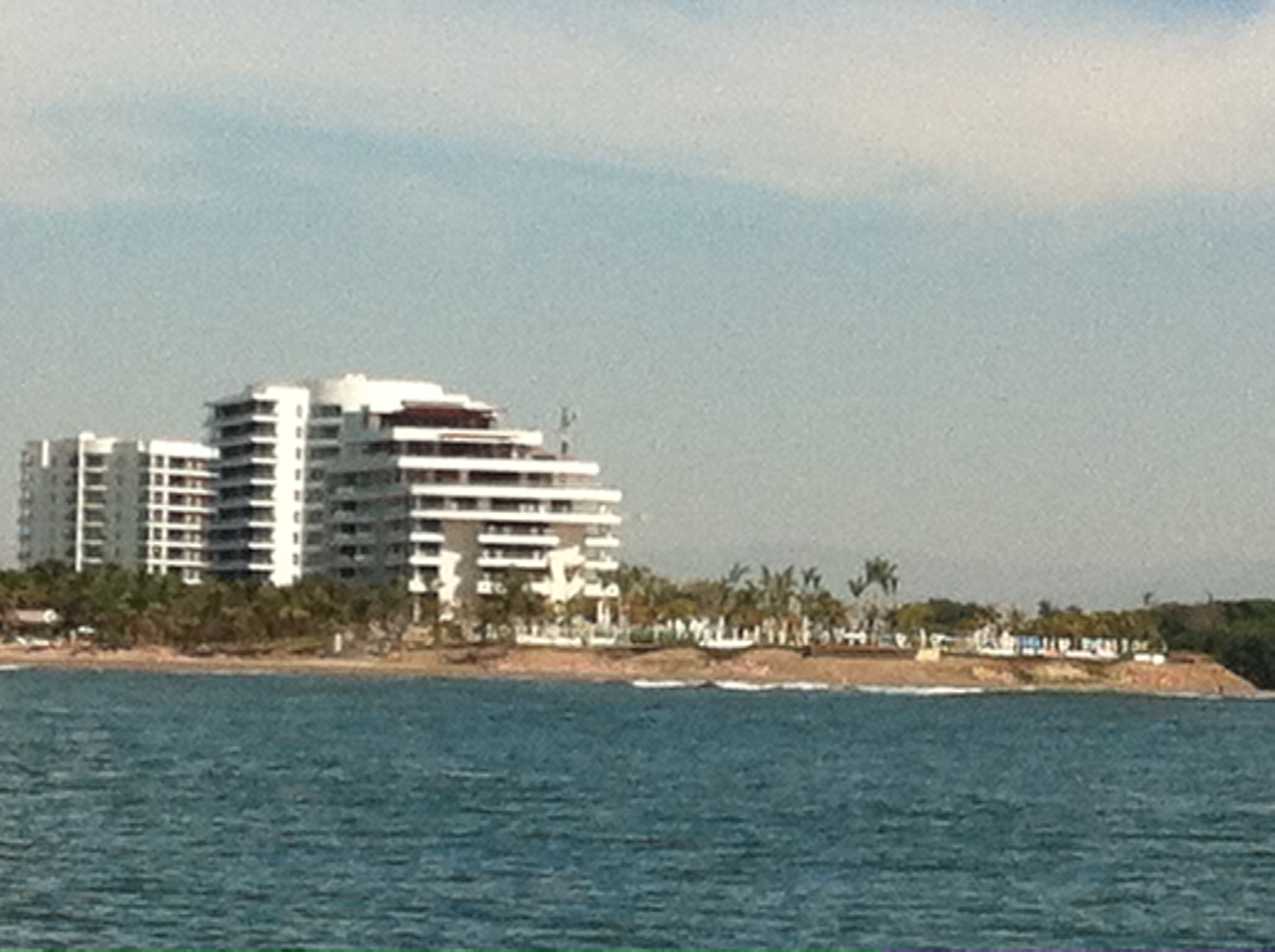 On November 10, 2011, KMACKERMANN took this photo of the Grand Luxxe Residence Club buildings III, IV and V at Nuevo Vallarta, Mexico from a water taxi while she was heading home from Puerto Vallarta. Note: the sand spit that extended nearly a half a mile from the beach last year is there now. Yes, high tide.