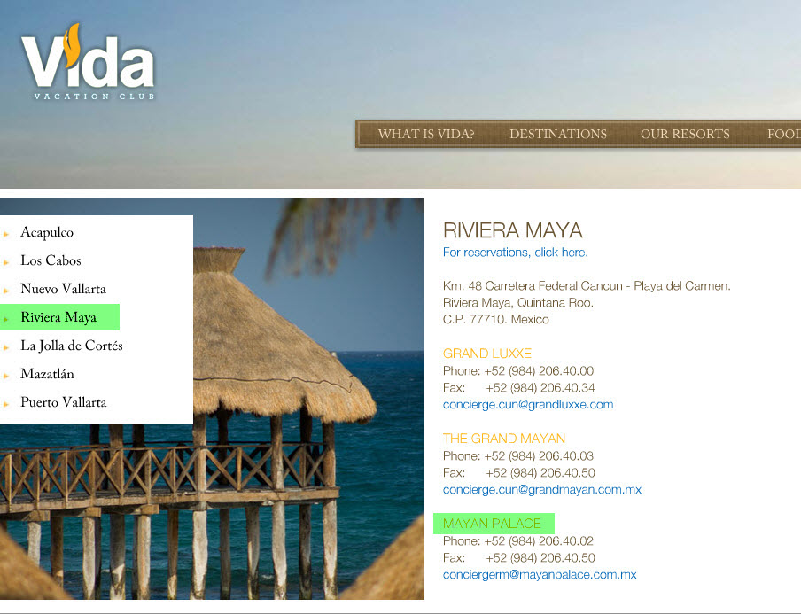 We have received calls asking how to contact the various resorts and corporate offices and thought it would be helpful if we could post the information in our newly formatted Contacts Page. The table below shows the current information for each operating resort in the Vida Vacation Club network as of February 9, 2011. We will post changes as we receive them.To use this table, simply click the word "Select". An image will download, which will contain the contact information for the resort as well as the email address for the resort's concierge. When done, close the application that displays the image. You can also save the image for future reference.