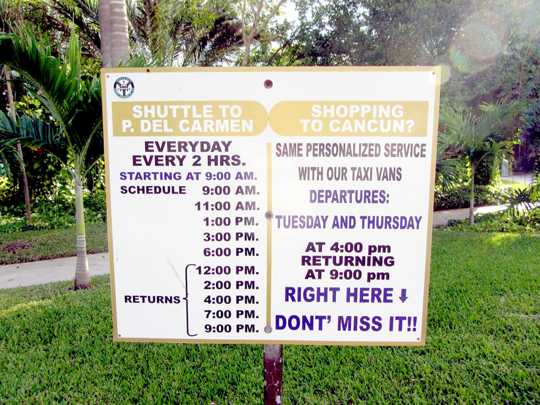 Here are some stores in Playa del Carmen (Please tap the photo to enlarge, then tap your browser's return arrow to return to this page.):Shuttle schedule from the Vidanta property: