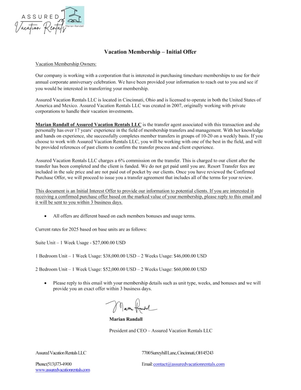 Another scam arrived yesterday. It appears to be similar to the alert we received from Shirley. Assured Vacation Rentals claims to have been representing companies and doing business since 2007. That may be true, but It was not using the domain called assurevacationrentals.com because that domain is only 156 days old. According to whoisdomaintools.com, the domain was created on December 12, 2024 and expires on December 12, 2025. The company claims to work with a company to make arrangements for an annual celebration. Here is what the introduction says: Our company is working with a corporation that is interested in purchasing timeshare memberships to use for their annual corporate anniversary celebration. We have been provided your information to reach out to you and see if you would be interested in transferring your membership. Take a look at the prices offered: Too good to be true!