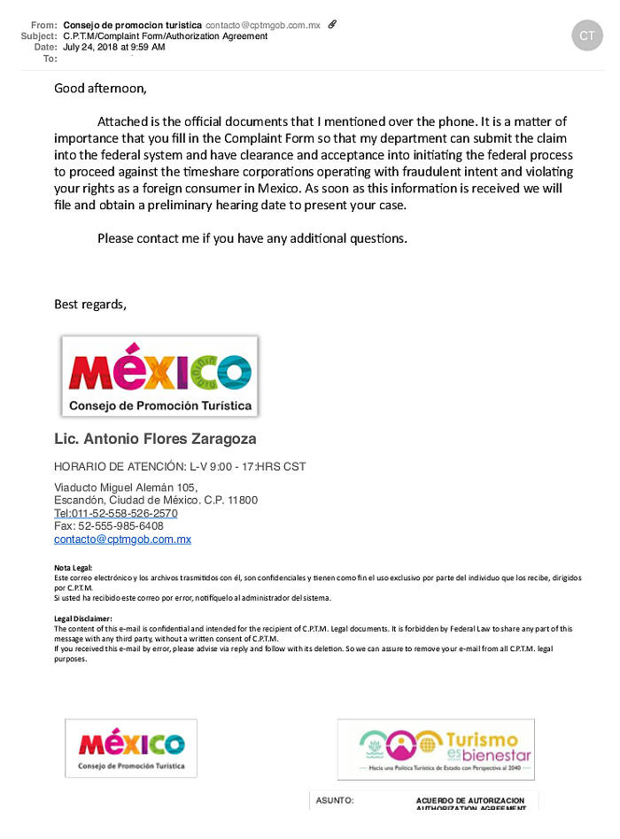 We received a call from Sr. Antonio Flores yesterday morning. Nice guy. Had our cell phone number, home phone and email address. Knew that we owned a timeshare in Mexico and wanted us to paricipate with the Mexico Tourism Board (CPTM) in its efforts to identify and prosecute scams coming from Mexico. Names he claimed to have investigated and stopped include Lone Star Vacations and others. Very convincing and engaging person. He was calling from 52-558-526-2570 (BTW - this number shows as a US number.).The caller asked a number of questions, indicating he did not have much information about our timeshare ownership. I asked if he had a form that I could review, and he said he would send it out for me to complete. Following is what he sent:
