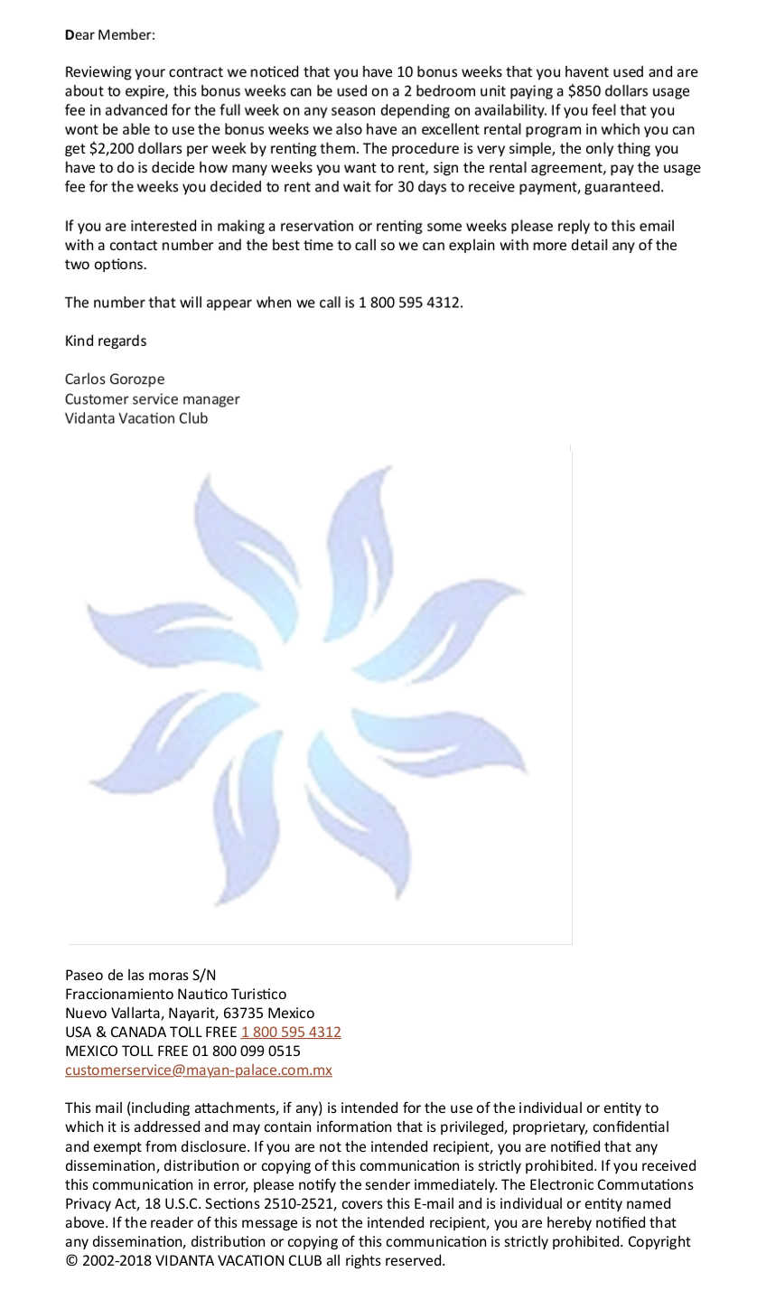This offer is from a domain called mayan-palace.com.mx. It states you can get $2,200 "dollars" per week by renting them. It also states the recipient has 10 unused bonus weeks, and they are about to expire. Sure....🙄