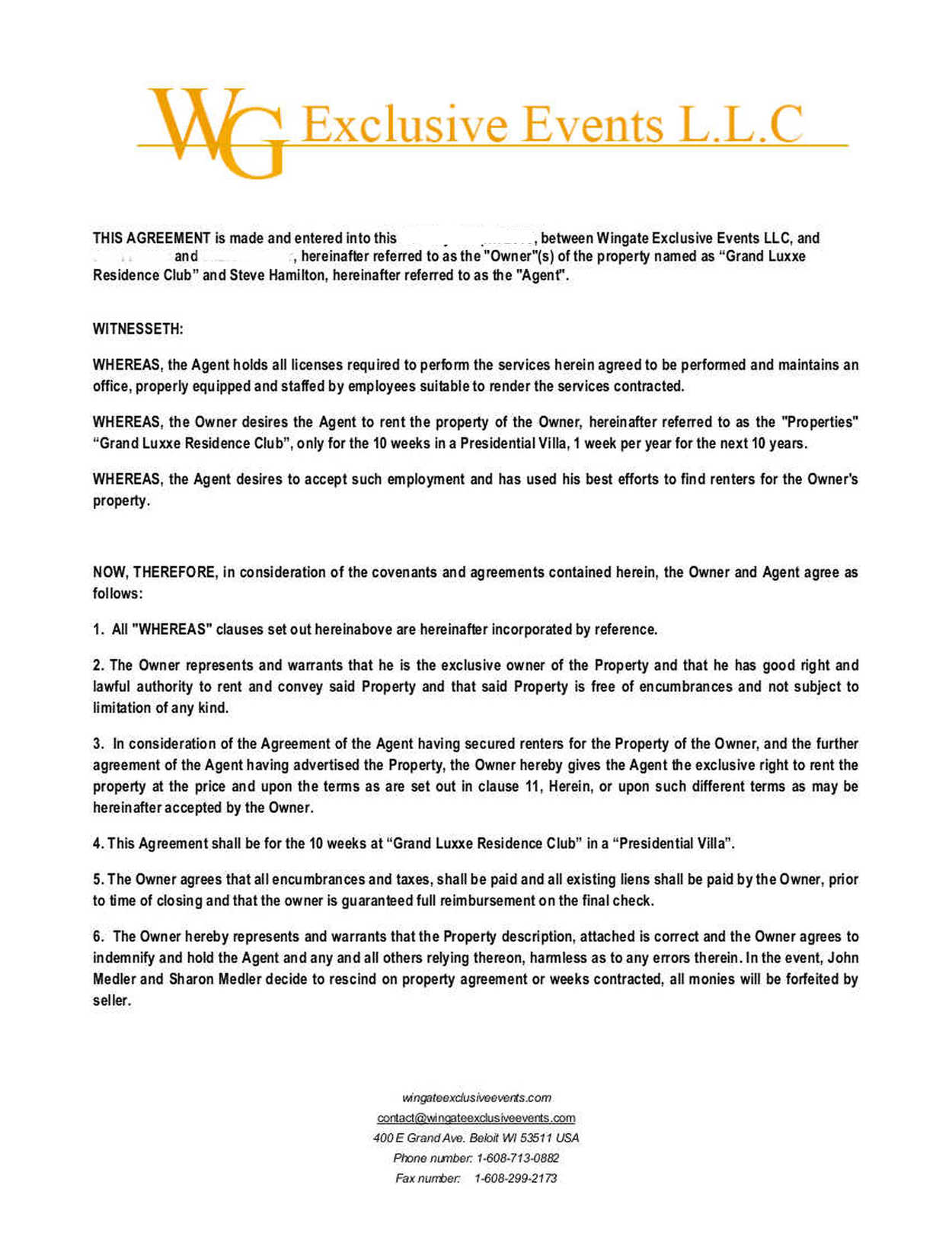 • The Owner(s) agree(s) to pay to the Agent at the time of closing. A commission of (7%) percent is paid to Wingate Exclusive Events LLC, 5 to 7 business days after owner receives final funding in full. (Note: This sentence is very confusing because the Agent is not Wingate Exclusive Events LLC.)