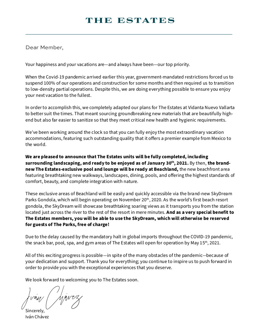 News From Vidanta - Estates Letter from Ivan Chavez: