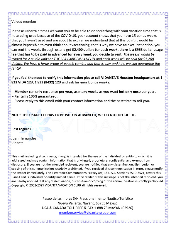 Our email folder has received four - that's right - Four invitations to visit "Vidanta-Group" to take advantage of 15 unused bonus weeks assigned to our account. Plus, the offer goes on to say we can rent the weeks through Vidanta-Group and get $2,400 per week. Oh, by the way, did I mention the cost? Nine hundred sixty five dollars - that's $965.00 usage fee - PAID IN ADVANCE!