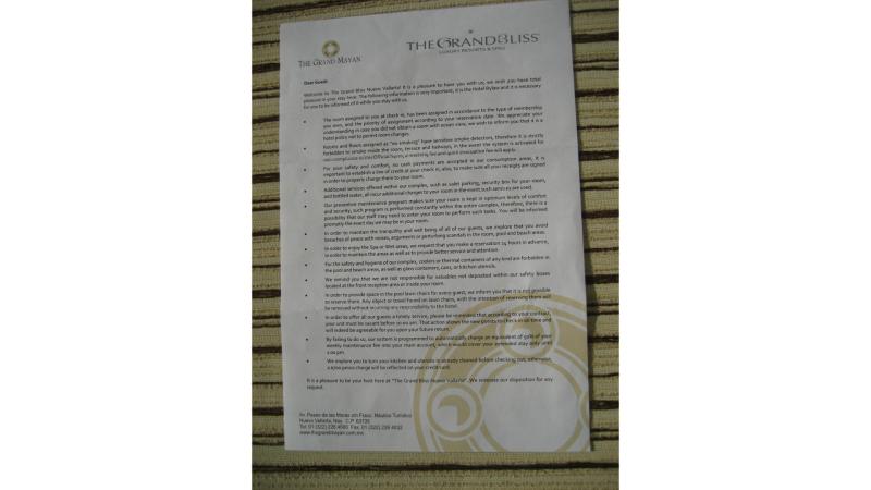 DescriptionLetter from management describing the process for selecting room assignments at the Grand Bliss Nuevo Vallarta.