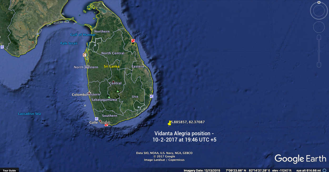 Vidanta Alegria is now off the southern coast of Sri Lanka: