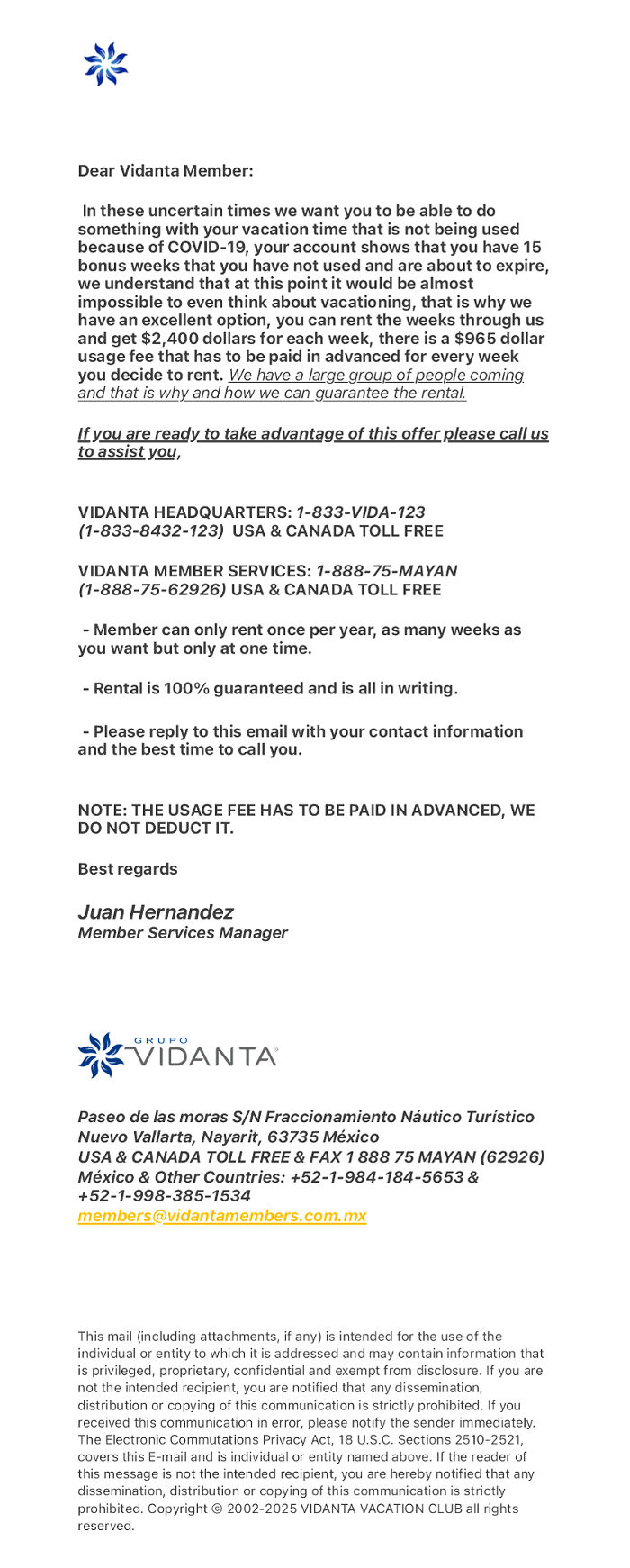 Hola everyone. Like you most likely did, we received our reminder that COVID-19 kept you and me from using our 15 bonus weeks. Uh, oh, and they are about to EXPIRE! Yes, that's what the correspondence said today. It is the same story we saw last year, at least five or six times - maybe more. The offer goes on to say that we have an excellent option to rent each week through "vidantamembers.com.mx", which is NOT a Vidanta domain. In fact, the domain is only 98 days old. Here is what whois.domaintools.com reports on vidantamembers.com.mx: Dates 98 days old Created on 2022-09-30 Expires on 2023-09-30 Updated on 2022-11-16 The offer is convincing. In fact, an Aimfair member called today and asked about it. Here is a copy of the email we received today: This offer arrived today - January 6, 2023, and it is the first time we have seen this scam......this year.