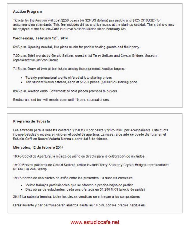 An Art Auction will be held on February 12, 2014 at the Estudio-Cafe next to the Marina in Nuevo Vallarta. This gallery displays the art pieces that will be auctioned in a Southebys style auction.