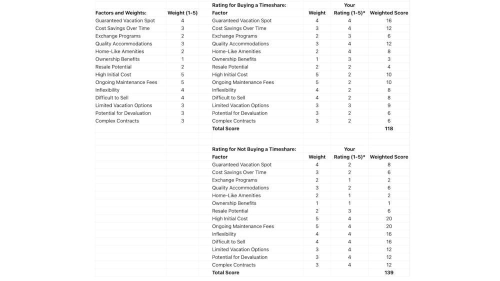 The idea is to create your own pros and cons. List them, and give each item a weight in terms of importance. That list and weights becomes a basis for creating an interactive spreadsheet to help you see timeshare purchases in the "cold light of day".