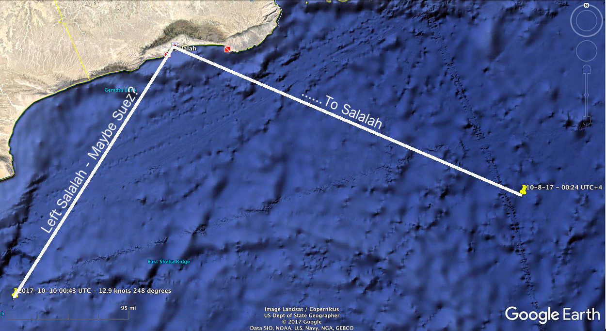 Vidanta Alegria's first port after leaving Singapore was Shalalah, Oman. It arrived on October 8 and left the next morning. There was no destination given other than the Red Sea area and Armguards Oboard.