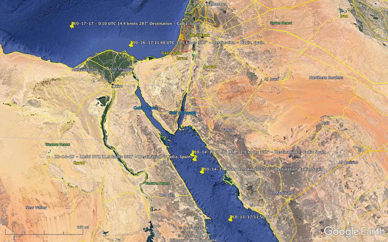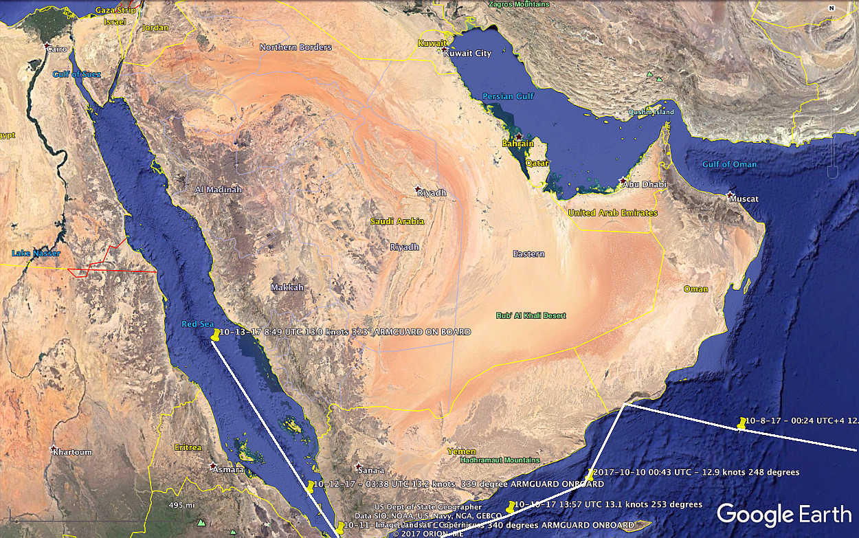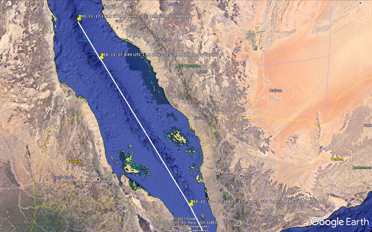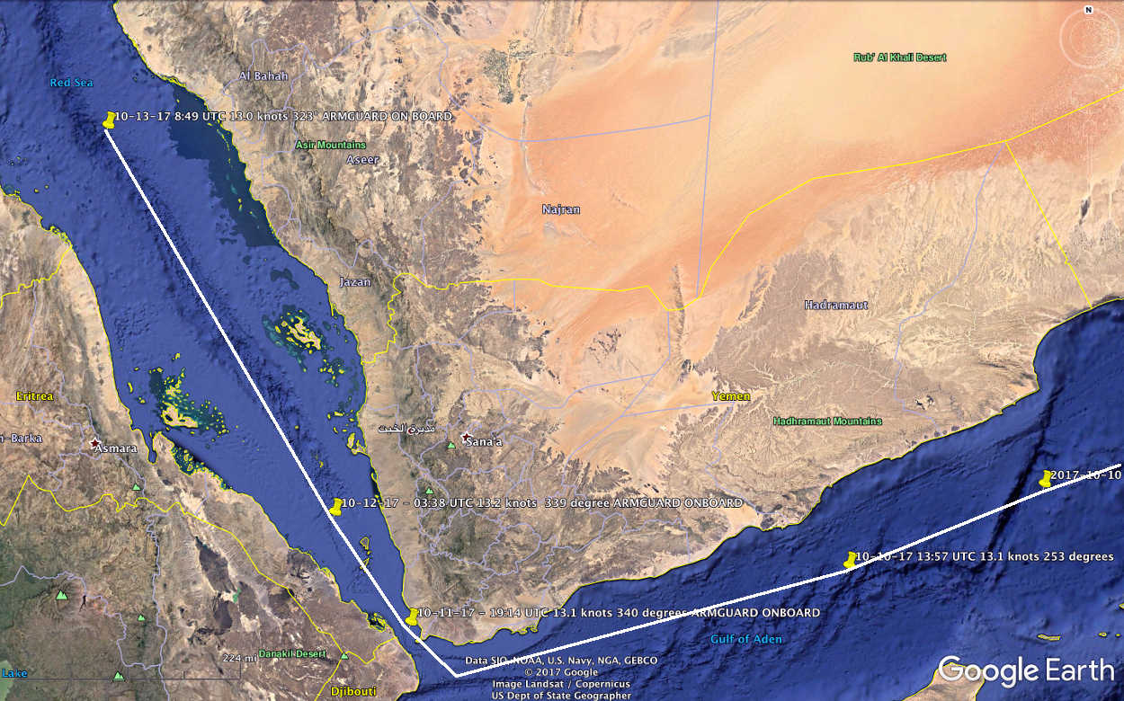 Vidanta Alegria has traveled more than 1,300 nautical miles since it entered the Red Sea on October 11, 2017. The Red Sea is an interesting and potentially dangerous part of the world. It appears the ship had armed guards on board as it traveled through the Red Sea.