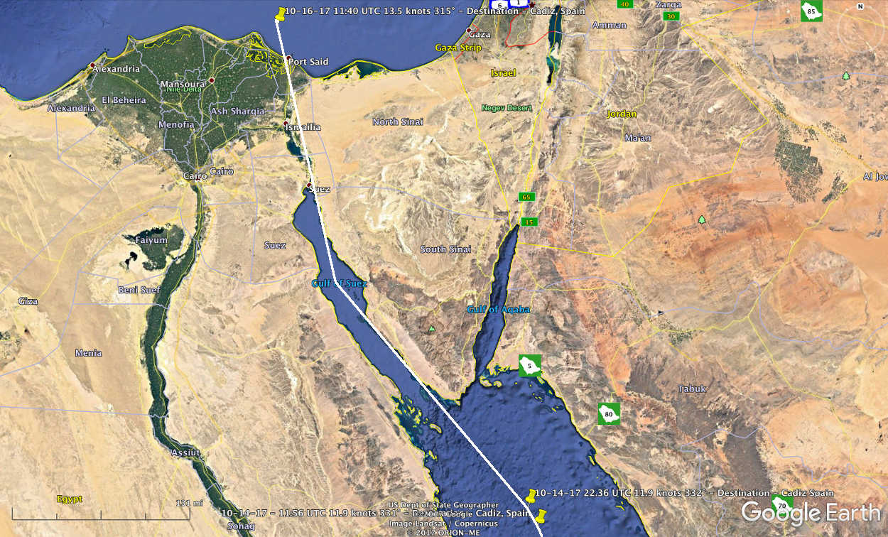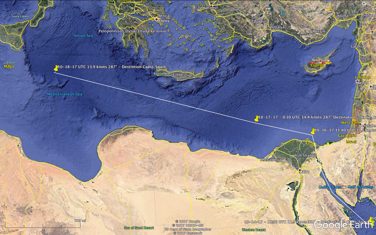 Vidanta Alegria has traveled through the Suez Canal and is on its way to Cadiz, Spain. The ETA according to MarineTraffic is October 23, 2017.