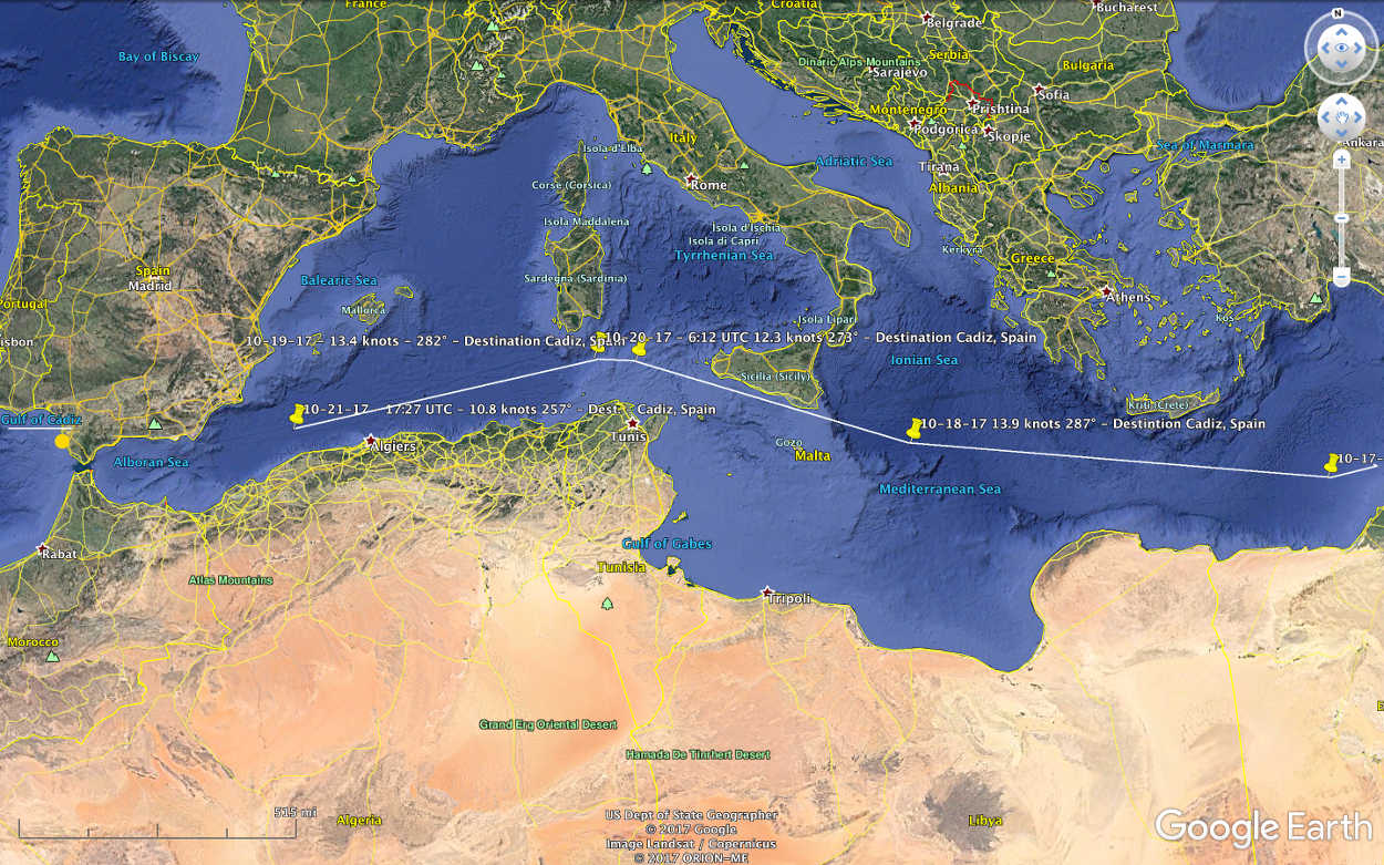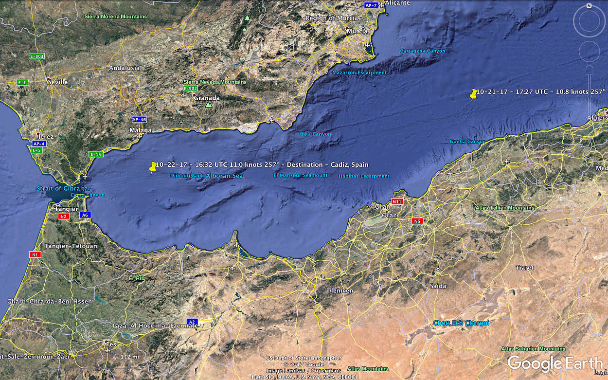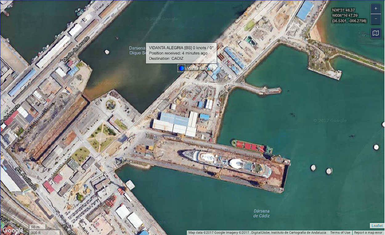 The following maps are updated when possible showing where Vidanta Alegria was according to information obtained from MarineTraffic.com and Google Earth. Although the destination provided by MarineTraffic.com is the Red Sea Area for now, the site does state Monday, October 23, 2017 is the current estimated arrival date at the ship's next destination - Cadiz, Spain. In fact, Vidanta Alegria did arrive Cadiz, Spain as reported.