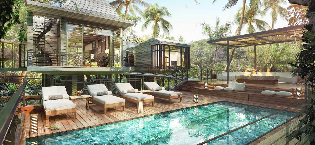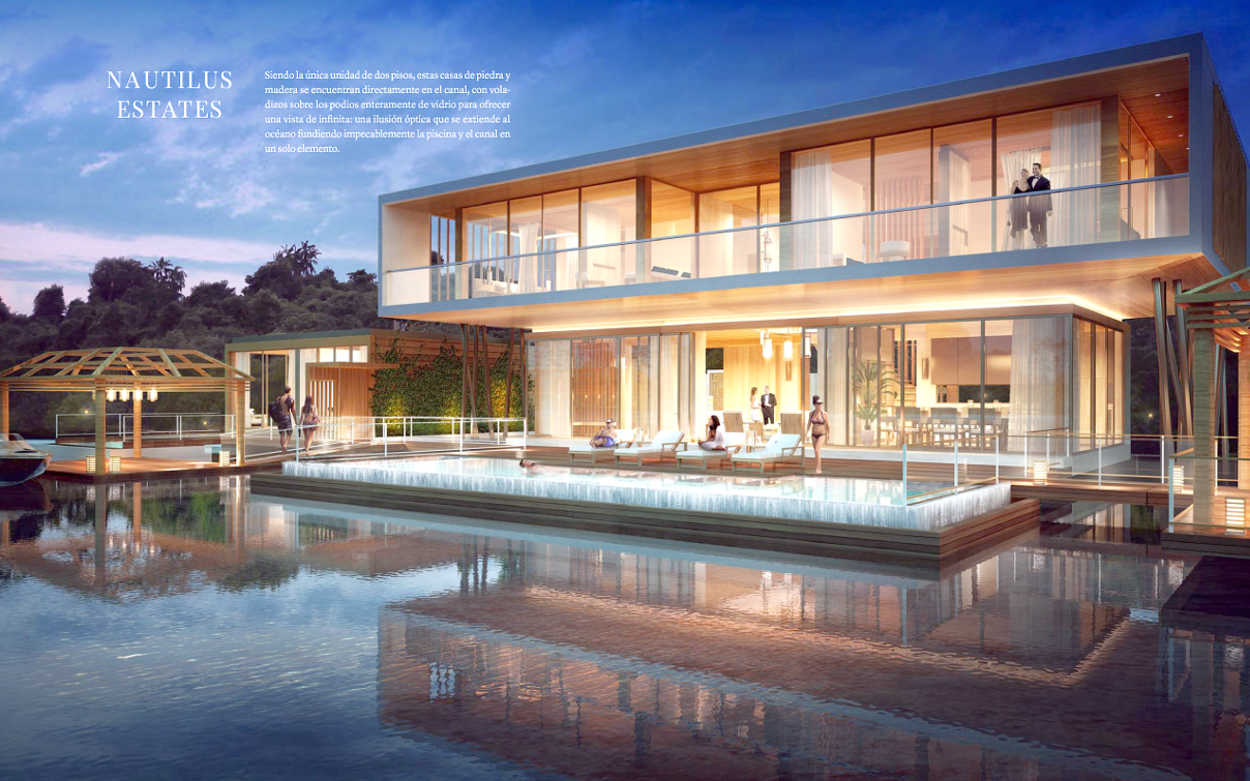 "Being the only two-storey unit, these stone and wood houses are directly on the canal, with cantilevers on the podiums entirely of glass to offer an endless view: an optical illusion that extends to the ocean, blending the pool impeccably and the channel in a single element."
