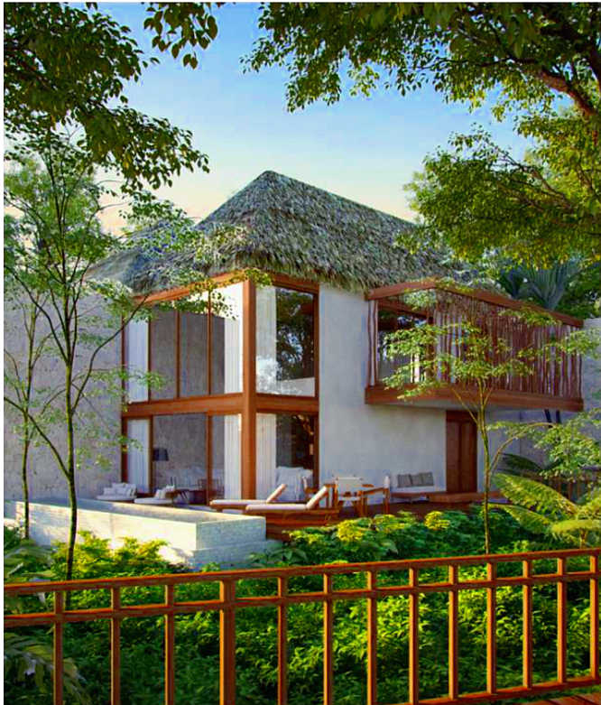 "Featuring a U-shaped design, in a more intimate community style, Villa Estates maintains privacy at the same time that it shares a path covered by a vineyard. In these units, the flat and modern ceilings are favored on the palapa. The windows from floor to ceiling open the plane towards the vegetation, so that the bedroom ends up feeling more like a garden."