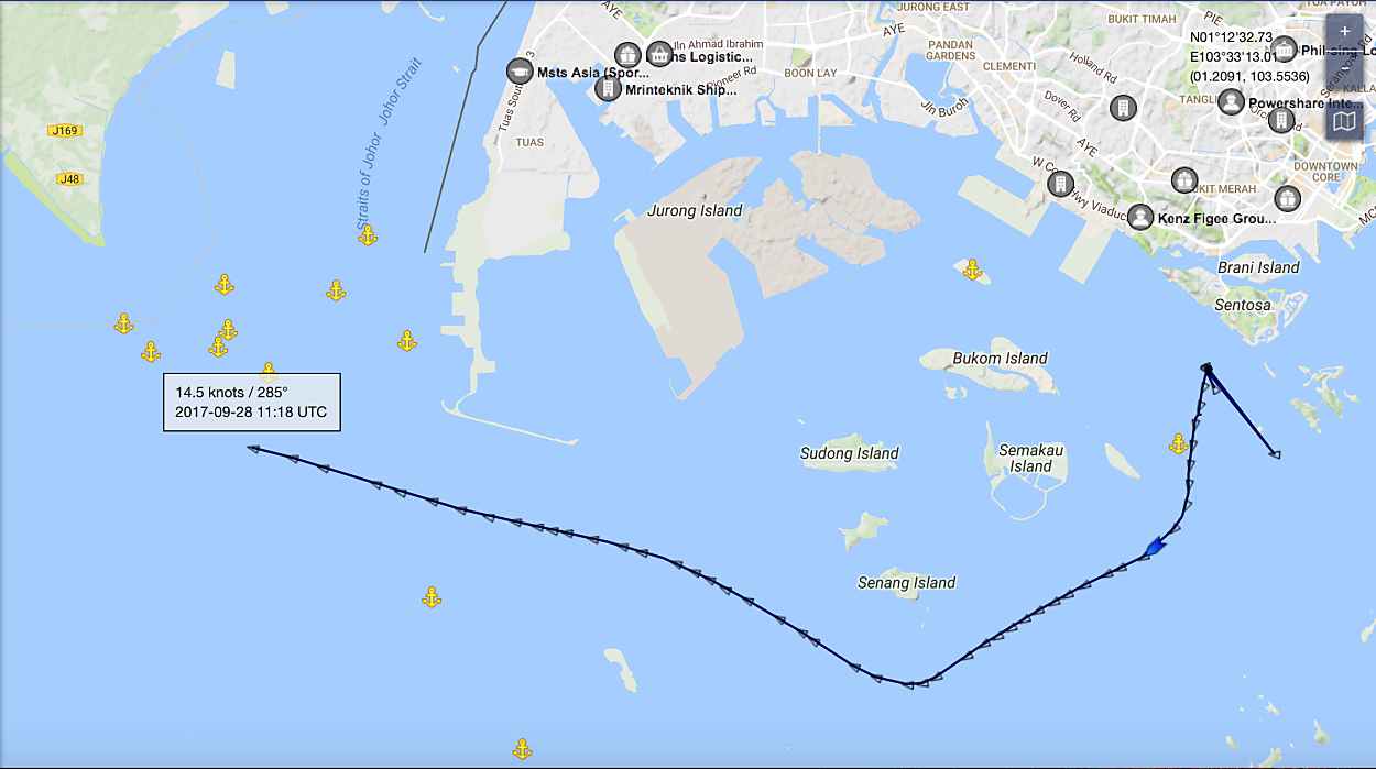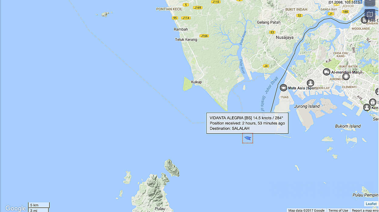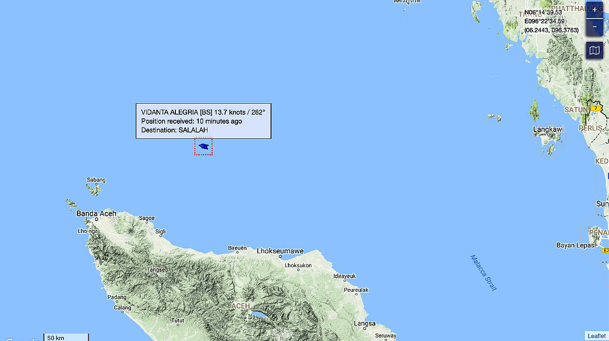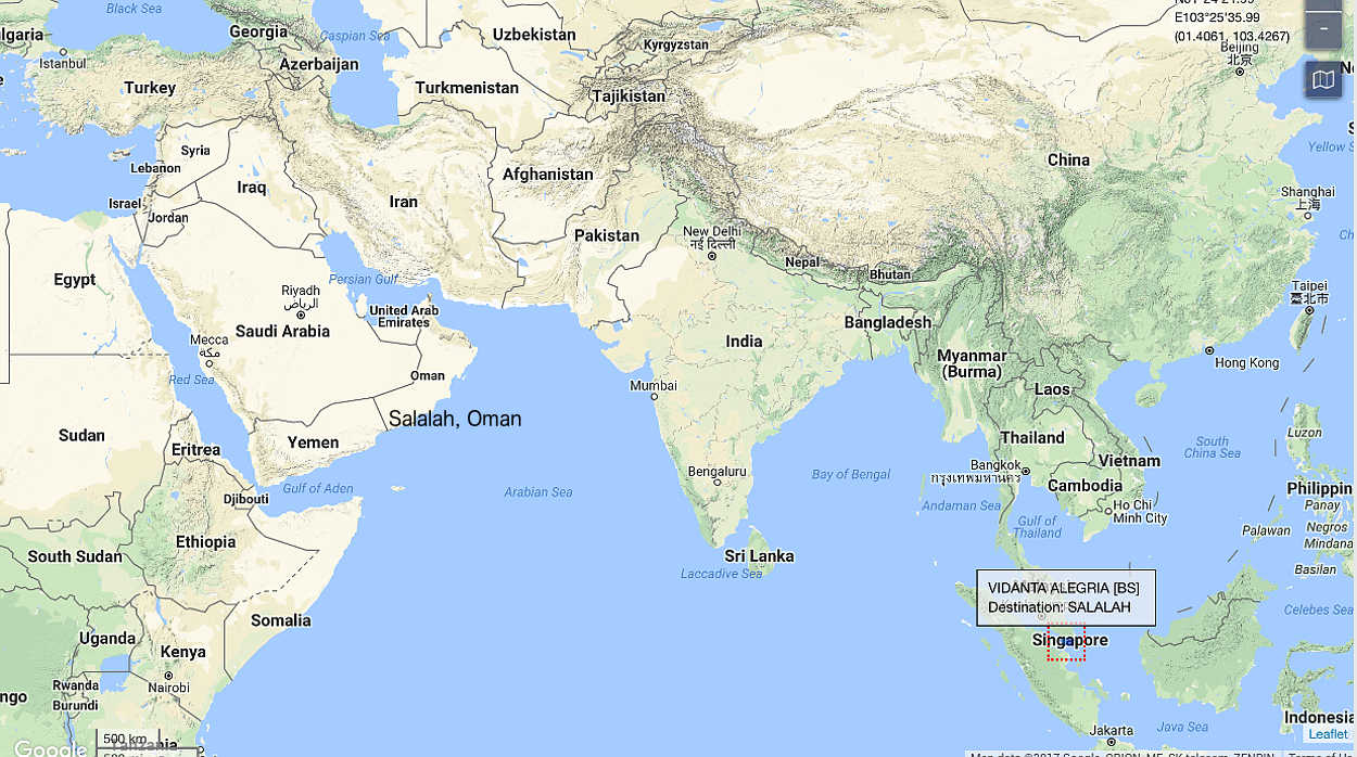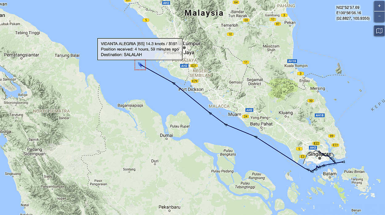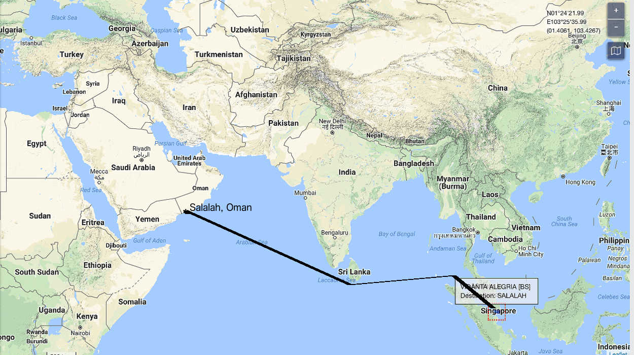 Vidanta Alegria is now in the Malacca Straights on its way to Salalah, Oman. Could be a 10 day trip.