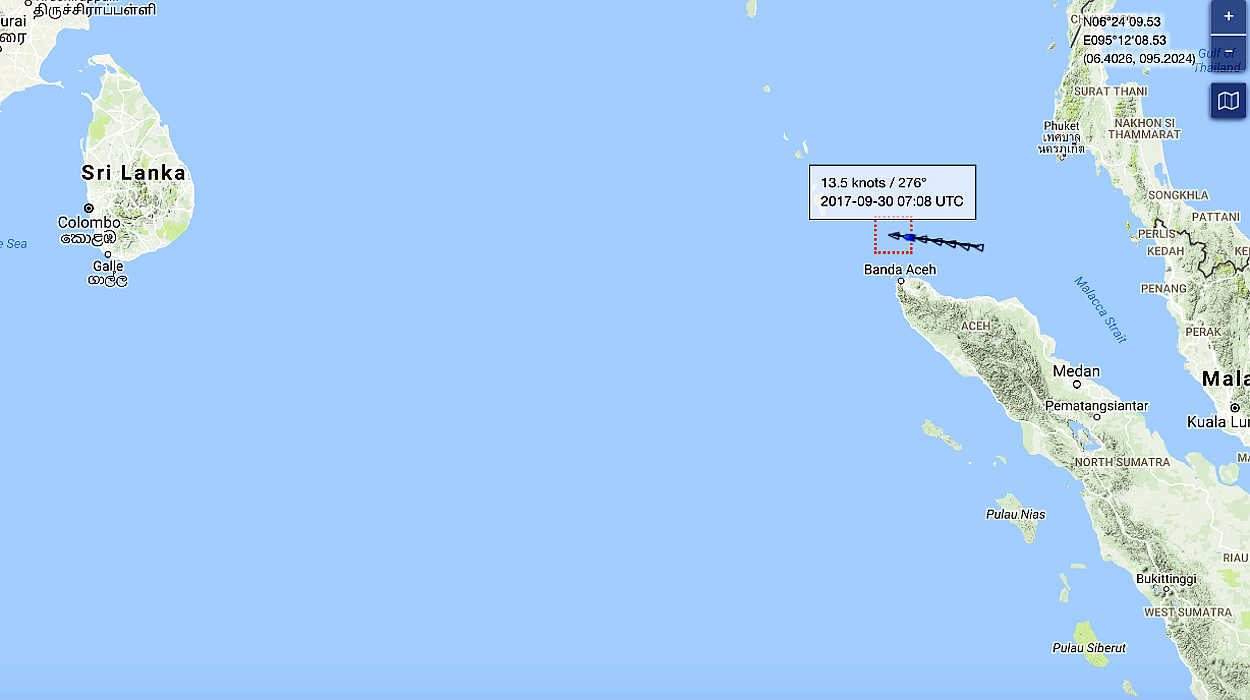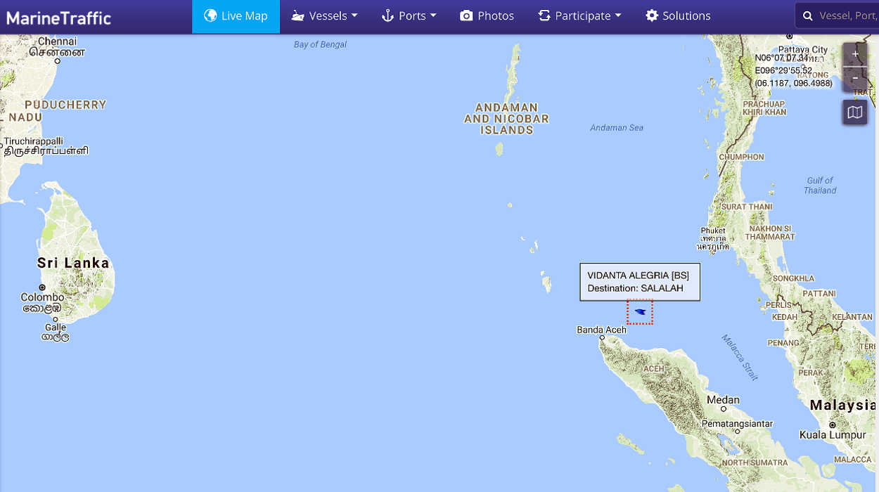 Vidanta Alegria is off the coast of Banda Aceh, Indonesia and heading WNW on its way to Salalah, Oman. This will be a 10 day trip, with an estimated arrival date of October 8, 2017.