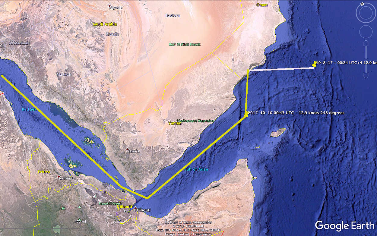 The first port of call for Vidanta Alegria was Salalah, Oman. The ship arrived on October 8, 2017 at 22.14 Local Time and departed on October 9, 2017 at 12:45 Local Time. It was last reported about 220 miles south west of Salalah, Oman and appeart to be headed for the Suez Canal.