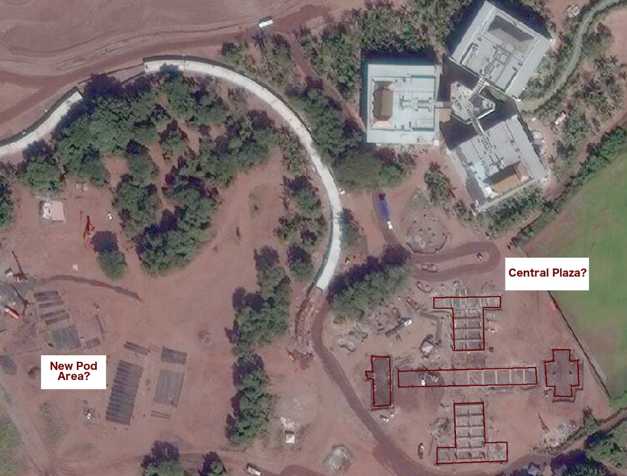 Another larger structure is in the early stages of construction. A shovel/excavator is digging out a large rectangular area that appears to be five to six feet deep, if not more. This activity is south of the central plaza construction site by about a quarter of a mile. The area is pretty large, so it is possible it could be the site of a building that has a different configuration from the Pods. Time will tell.
