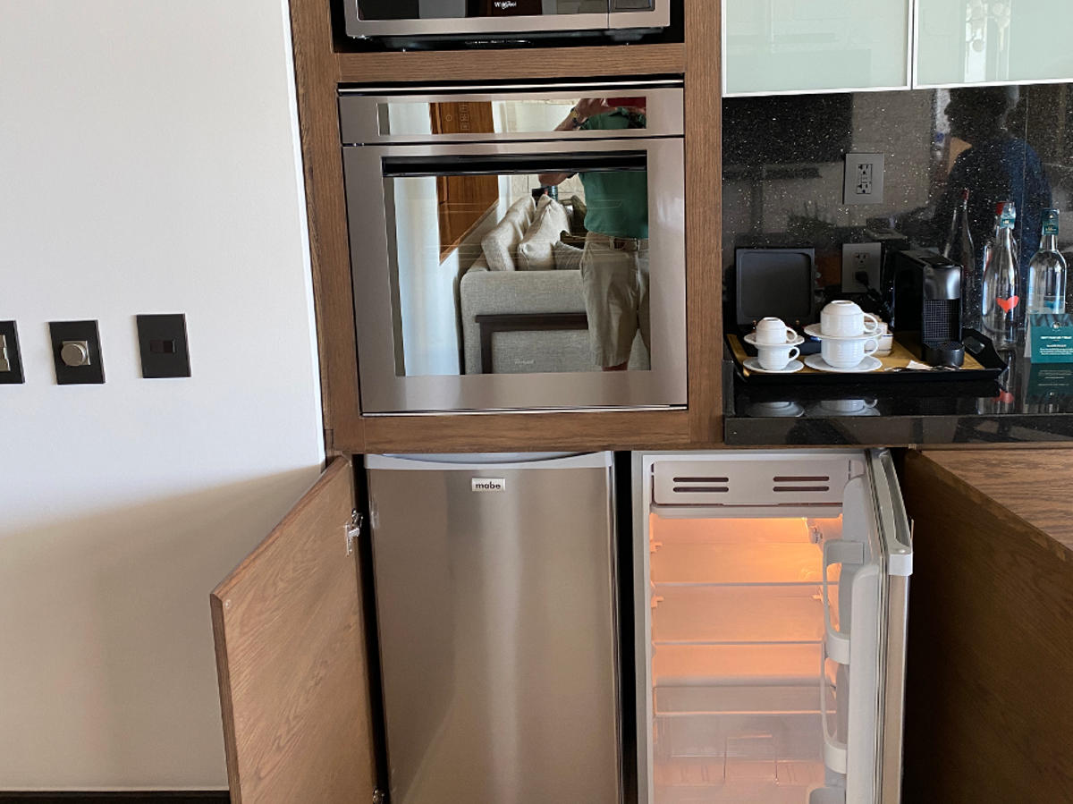 The kitchen area cooking space and layout is easy to move around in. The only comments we have received are about the size of the refrigerator, which is OK, and the oven, which is small.