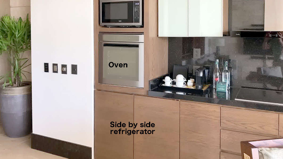 The kitchen area includes side by side refrigerators, an oven that is on the small size, a microwave oven, a cook top and a dishwasher. Plenty of room for two. Four would be crowded.