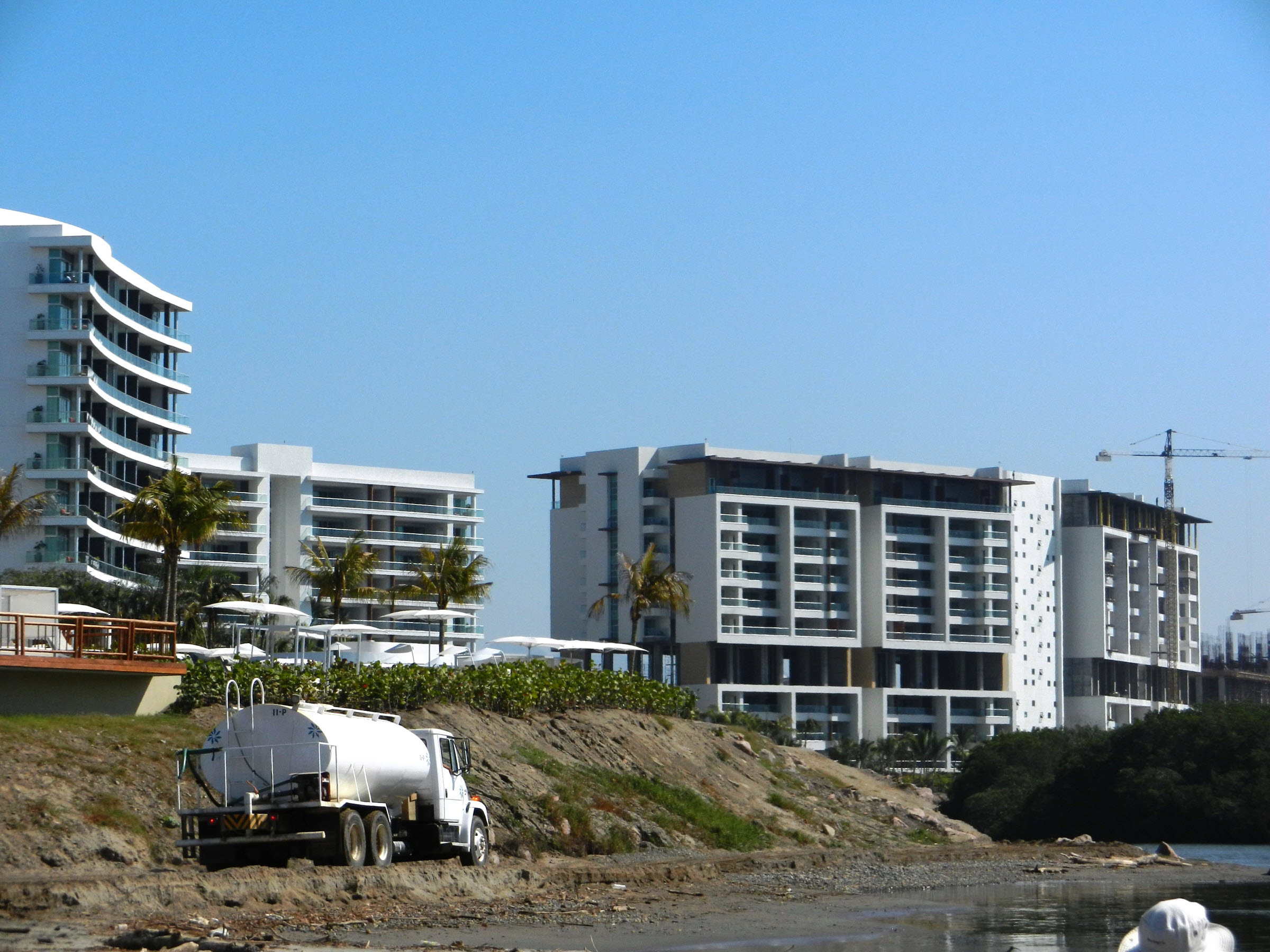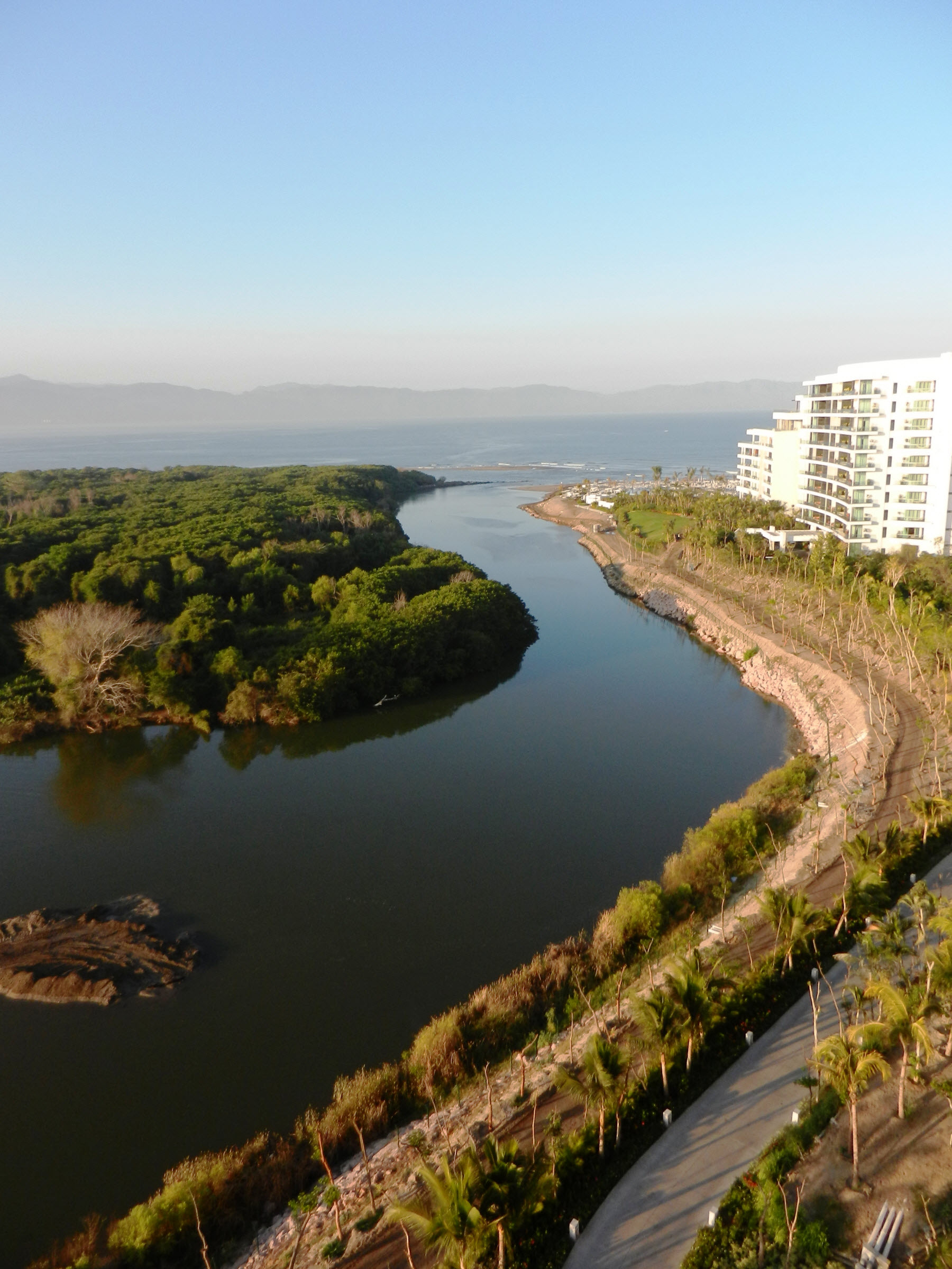 This view of the Ameca River shows the road taken by trucks and heavy equipment used to dig and transport dirt from one end of the Vidanta Mayan property at Nuevo Vallarta to another. The buildings on the right are Grand Luxxe Residence Club towers and the Punta. We hear this will become a river walk, which will be a pleasant way to walk from Towers III, IV and V to the beach.