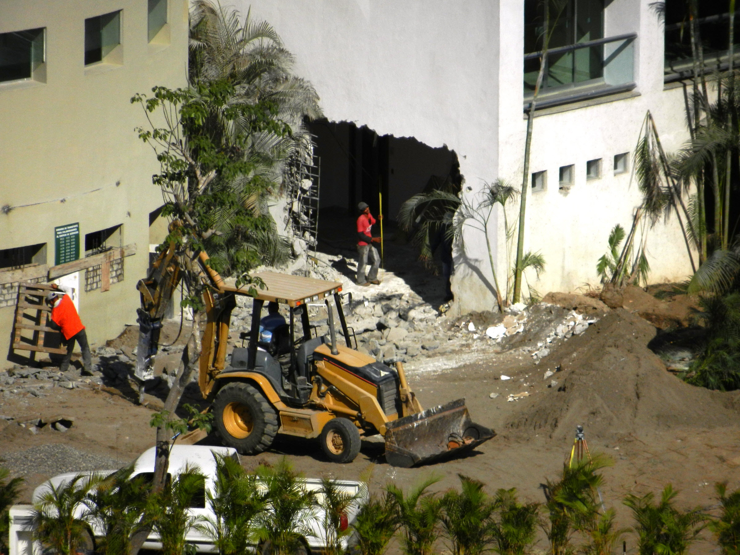 This photo is a graphic representation of the amount of work taking place on the Mayan Palace building in Nuevo Vallarta, Mexico. The entry way created by poking a large hole in the side of the building allows workers to access the ground floor of what was an operating hotel about three weeks ago, at the end of March, 2012.