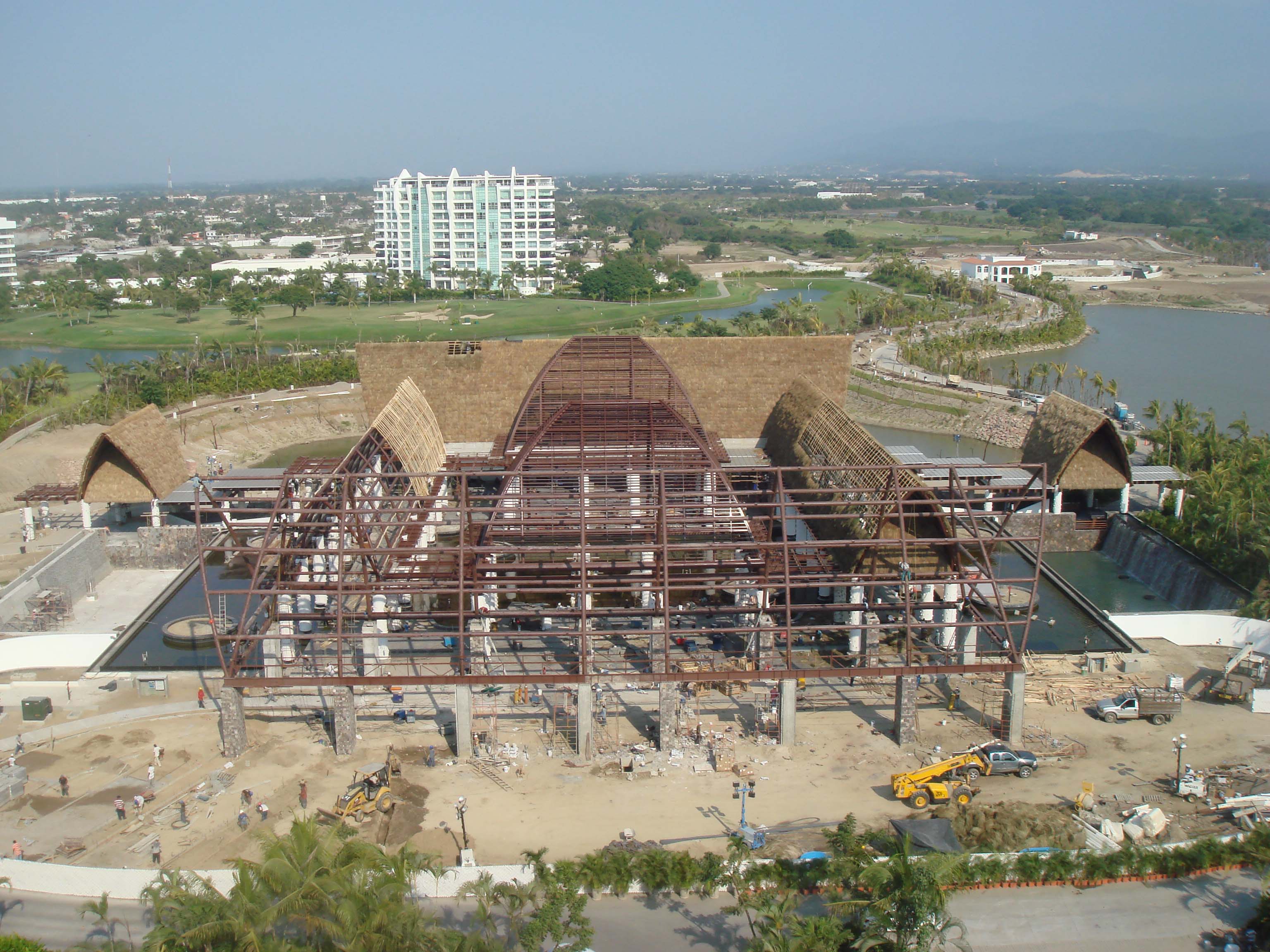 Directly in front of the Grand Bliss is rising a large steel-framed "palapa" which will be the central train station.
